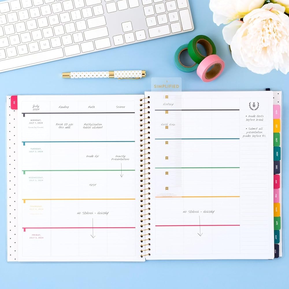 Track tasks and priorities with this Simplified by Emily Ley for AT-A-GLANCE Customizable Weekly Monthly Planner. This planner covers 12 months from July 2025 — June 2026 and is guaranteed to last all year.* The Lilac Plaid features bold lines and pops of purple. Keep the cover design or personalize it by slipping a photo or agenda into the clear front sleeve. Plan your schedule without fear of distracting ink bleeding. Our high-quality paper is designed for ink bleed resistance, which helps keep plans neat and legible. Weekly spreads feature ruled planning space Monday – Sunday plus check boxes to track tasks. Pages measure 8-1/2" x 11". Monthly spreads have unruled daily blocks, a lined to-do section and a “simplicity tip.” Months are tabbed to quickly flip to any date. Special pages include The Process of Simplifying, How to Use the Planner, Simplicity Challenge, bucket list, holiday list, 1 notes page, a reference calendar and 2 future planning pages. Comes with a full set of colorful stickers to highlight important events, emphasize priorities and mark special occasions. Gold twin wire binding with durable poly covers. The Simplified collection of organizational tools was created to help busy women live simpler lives and create margin for the good stuff of life. *ACCO Brands will replace any defective AT-A-GLANCE planner that is returned within one year from the date of purchase. This guarantee does not cover damage due to misuse or abuse.