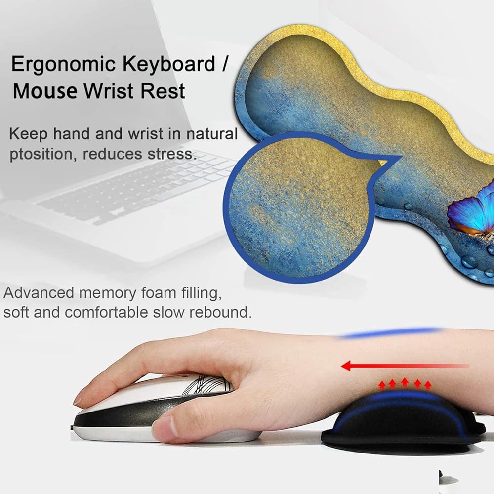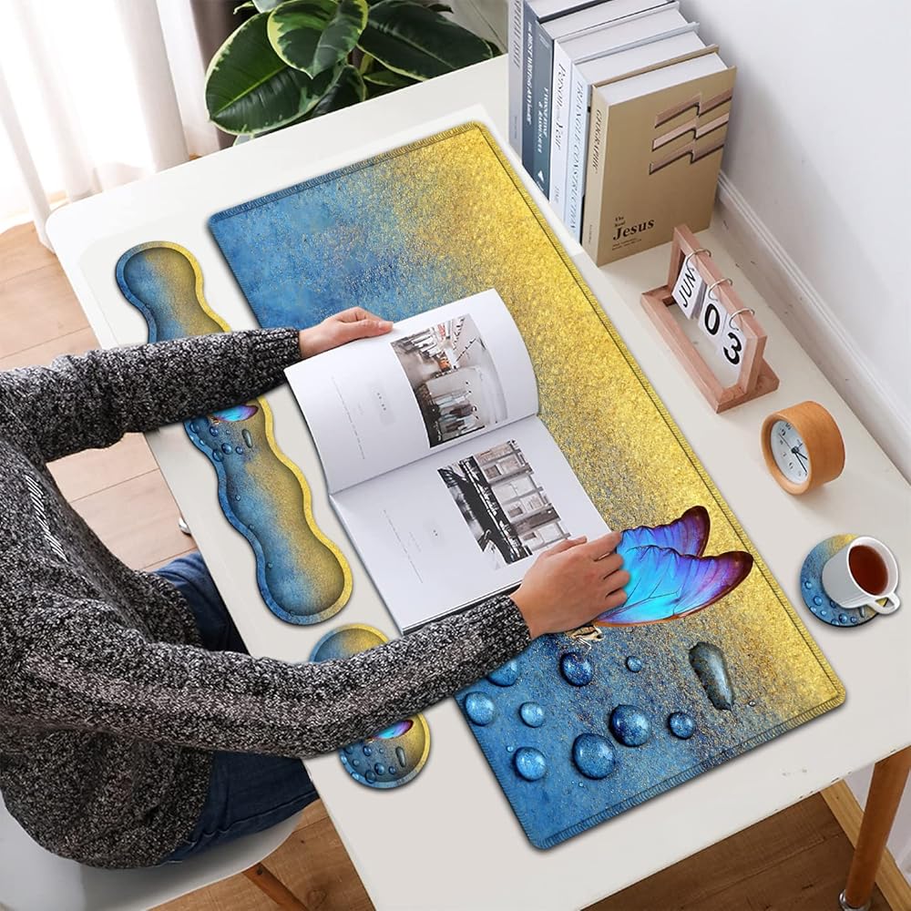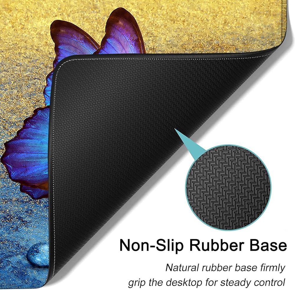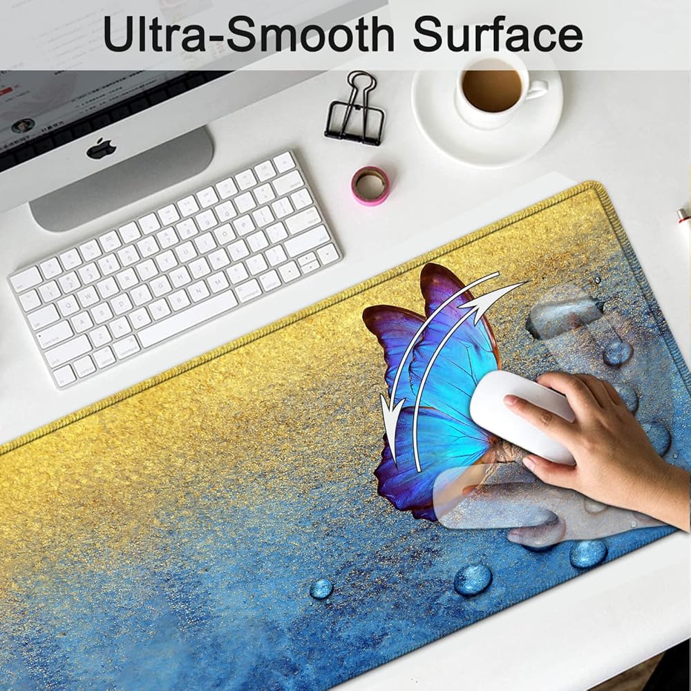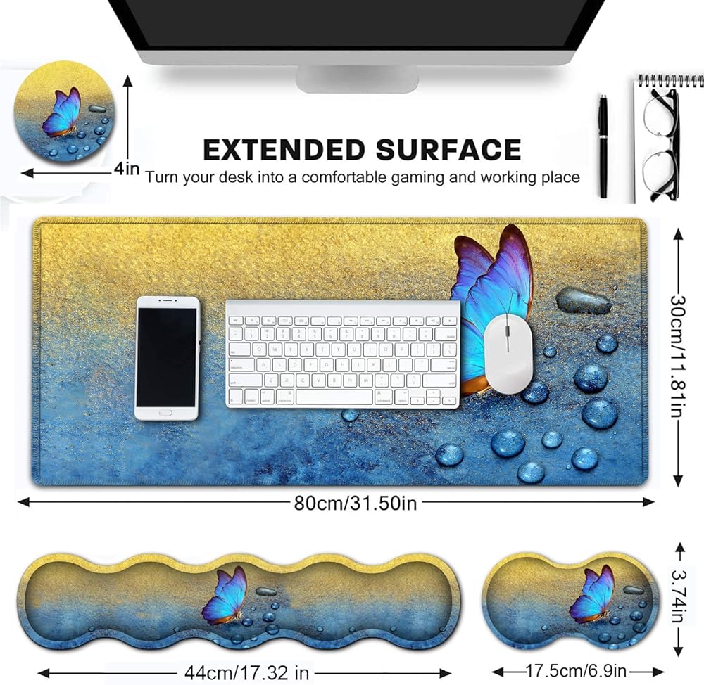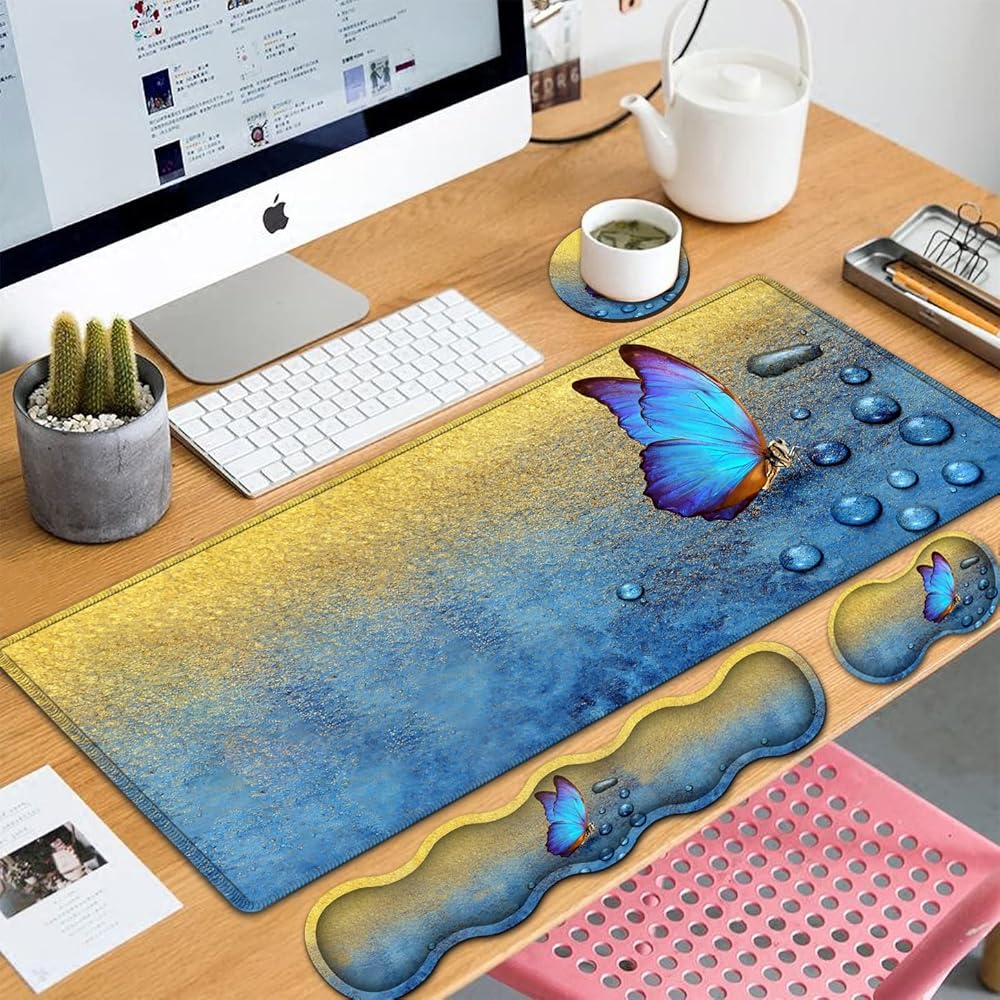 Large Gaming Mouse Pad,Extended Mouse Pad with Non-Slip Natural Rubber Base, Ergonomic Keyboard Wrist Rest, for Home/Office Desk Pad Writing Pad Blue Butterfly Pattern Mouse Desk Mat Wrist Rest Set