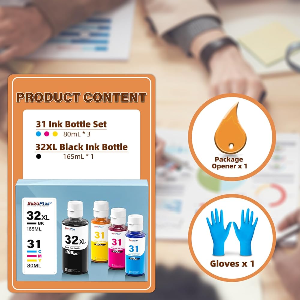 SubliPlus+ 31 Ink Bottle Set Contents: you will get 80ML 31 ink bottle set x 3, gloves x 1 pair and bottle cap opening gadgets x 1.