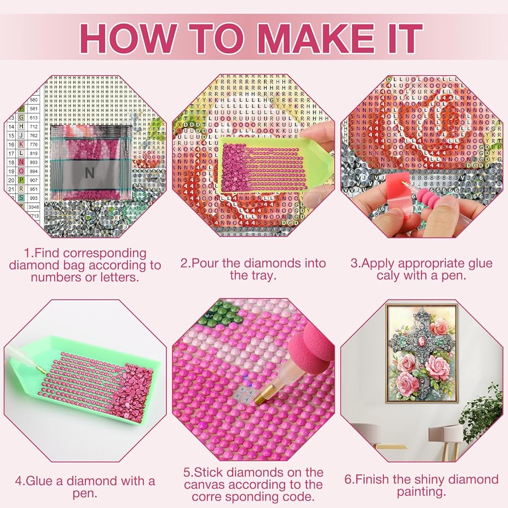 DIAMOND PAINTING KIT INCLUDES: Each Diamond Painting comes with all the tools needed, you will receive the following tools 1x canvas, 2x diamond pens, 1x diamond tray, 1x glue clay, 1x replaceablecorrection pen, 5x ziplock bags for diamonds and enough colorful diamonds to start your wonderful DIY experience