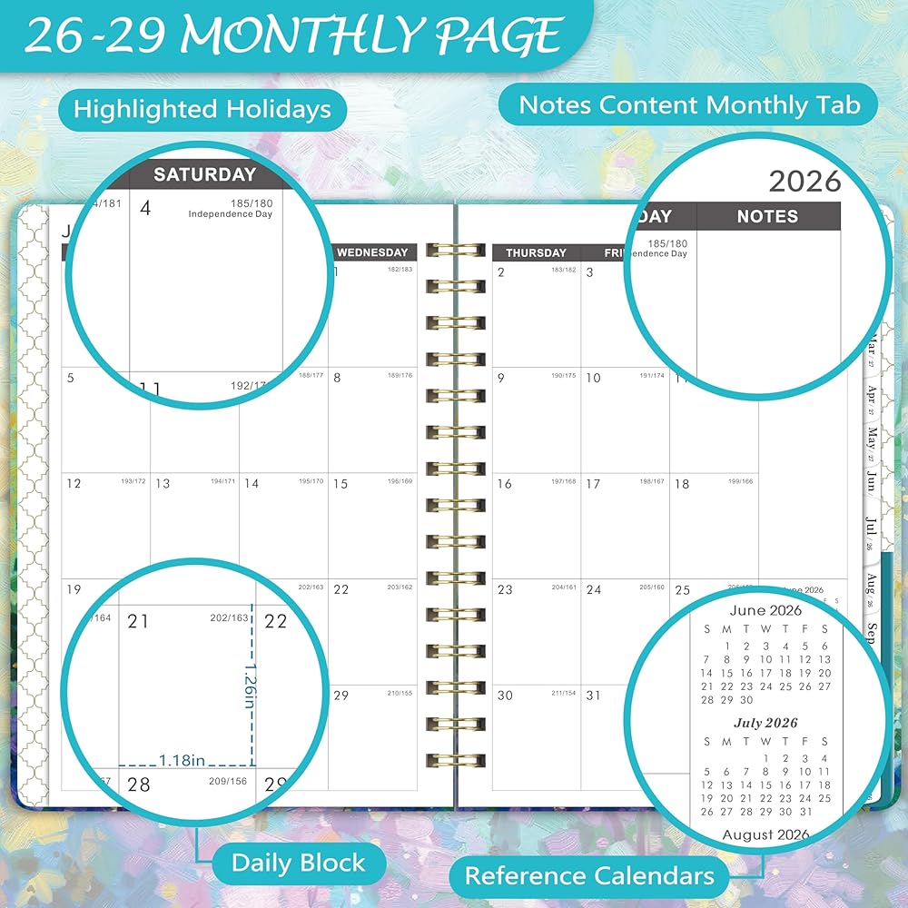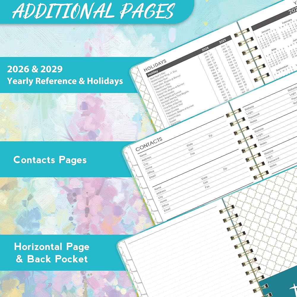 🌲 FUNCTIONAL DETAILS - Metal lay-flat twin-wire binding allows to open at one page + Features 12 monthly colorful marked tabs for quick checking + Past and future referencing in monthly page + Personalize your signature on the bonus title page.
