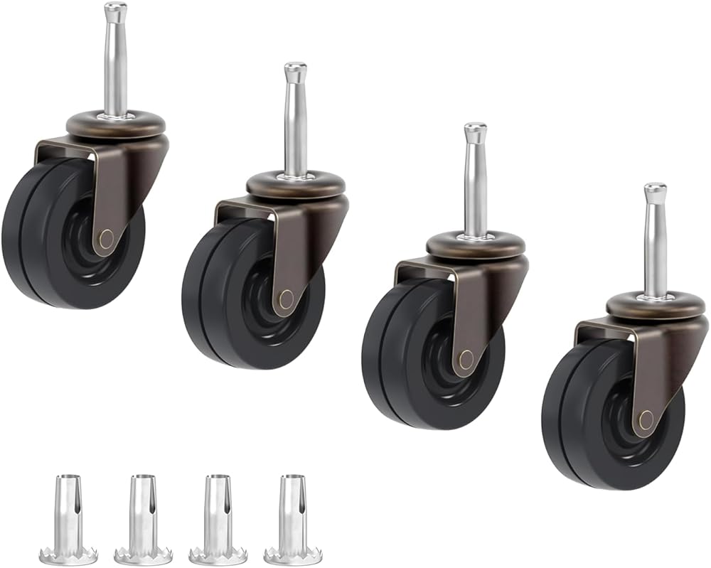 The package includes four casters with mounting sockets. These wheels feature ball bearings for smooth rotation.
