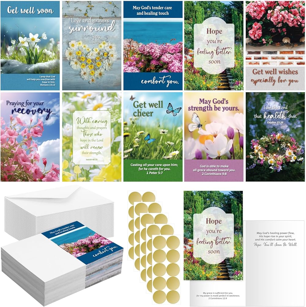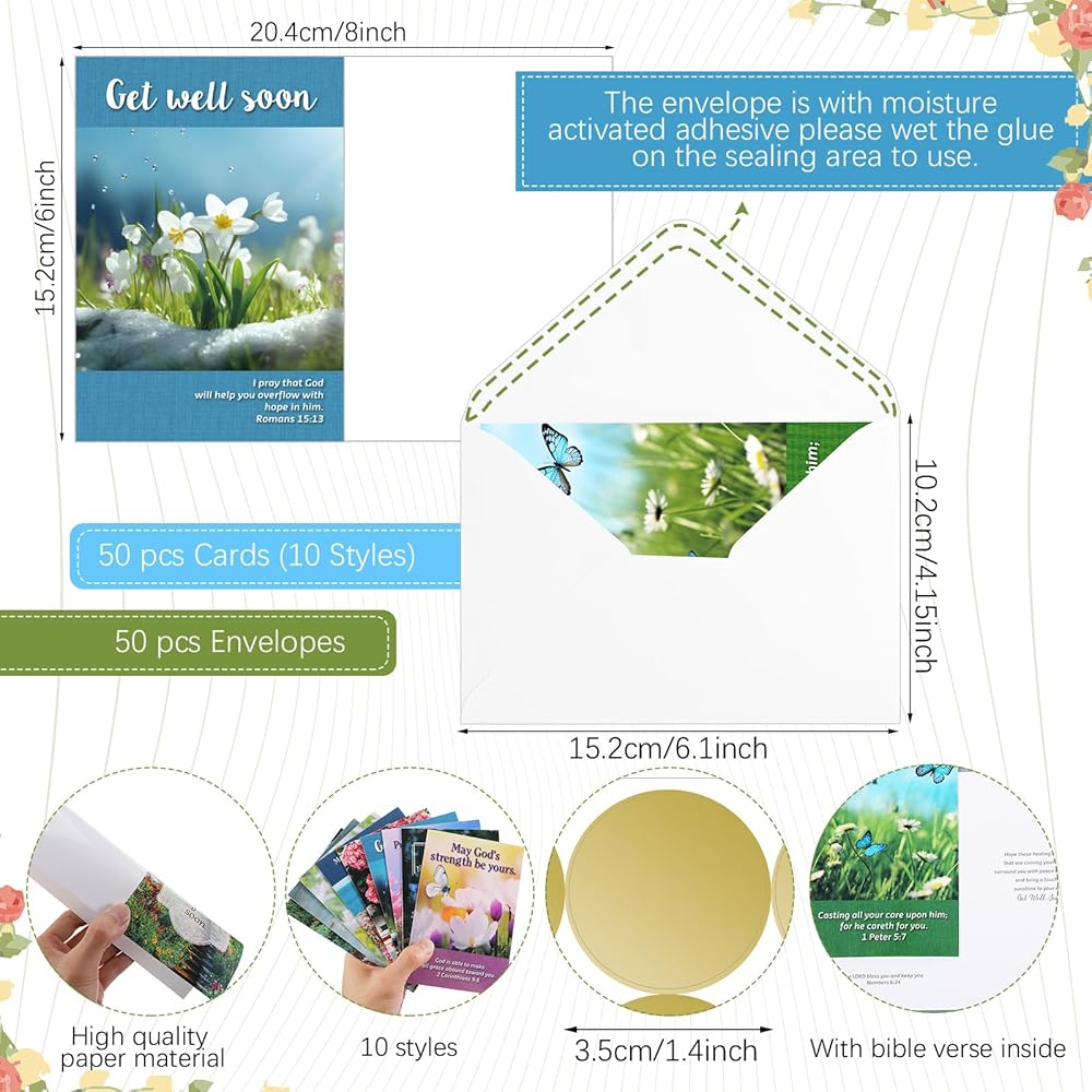 Each religious get well card includes a heartfelt message of encouragement and support inside, such as "With each passing day, may you behold the promise of God's word and the provision of His healing love", and with scripture design, such as "The Lord is my strength and my shield. Psalms 28: 7", provide solace and strength to those during times of illness or recovery, deepen religious belief and express your heartfelt blessings.
