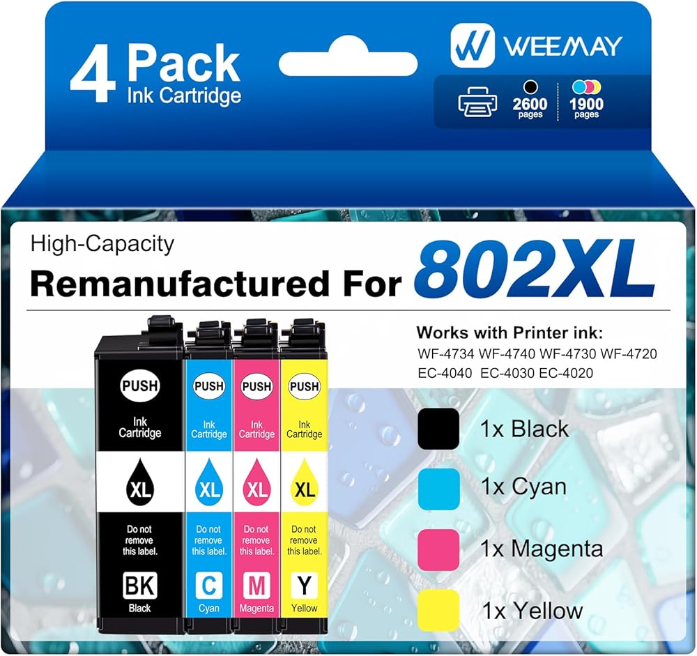 Weemay Remanufactured Replacement for Epson 802XL Ink Cartridges for Epson Printer Works with Workforce Pro WF-4734 WF-4740 WF-4730 WF-4720 EC-4020 EC-4030 (1 Black, 1 Cyan, 1 Mangenta, 1 Yellow)