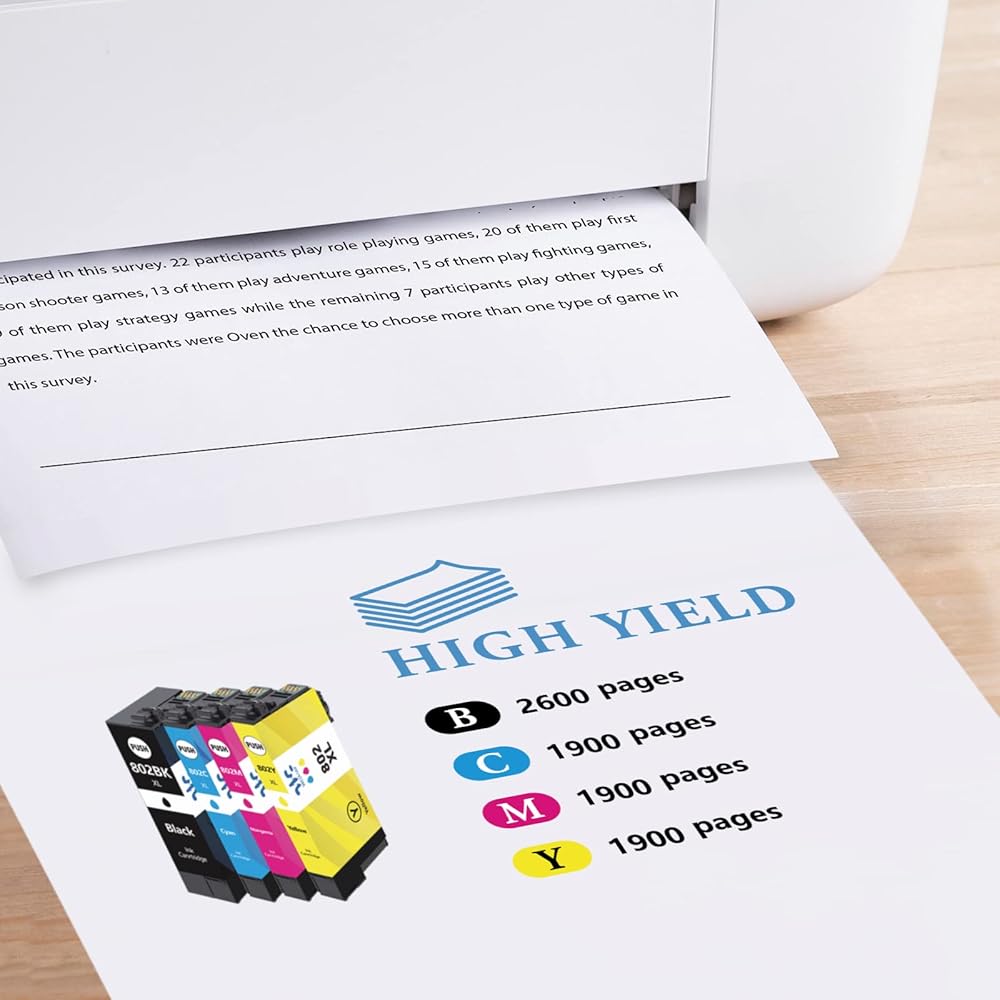 - Page Yield: Up to 2,600 pages per 802xl black ink cartridge; 1,900 pages per 802xl color ink cartridges (at 5% coverage)