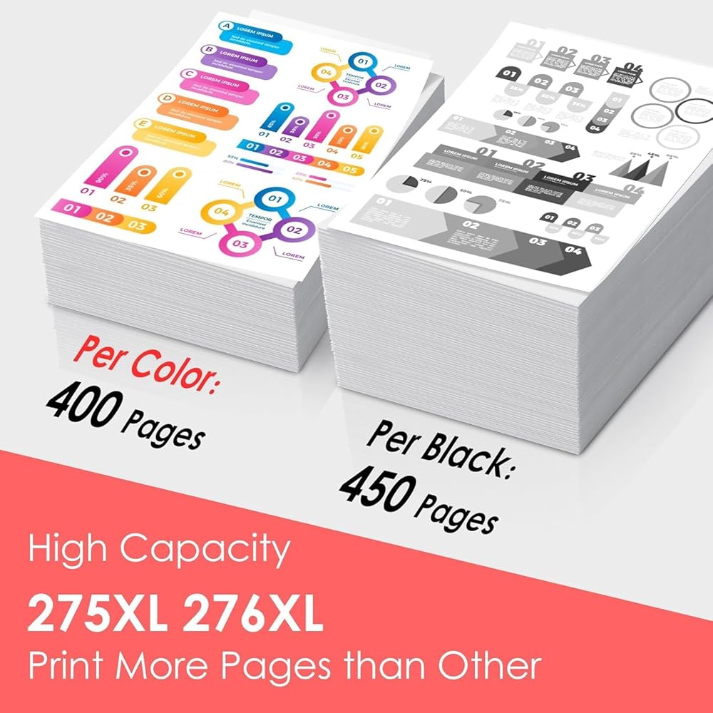[ Ink 275 276 Latest Upgraded Chips ]:Equipped with the latest chips, 275 276 ink cartridge for canon printers, which is stricted in quality control. Upgraded chips for instant identification