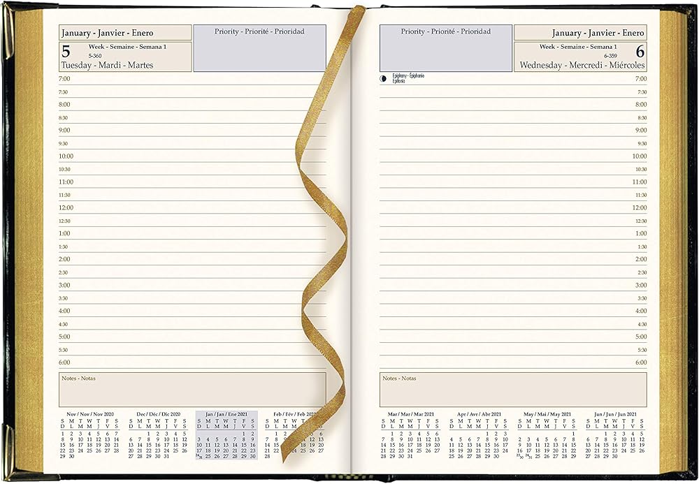 The Brownline® Executive Daily Planner and Appointment Book features 12 months of planning, spanning January 2025 to December 2025, with one day-per-page in an appointment schedule format. The Aristo cover is constructed with bonded leather and sewn-bound for a sturdy writing surface. Appointment schedule from 7:00 a.m. to 6:00 p.m. in half-hour intervals with Saturday and Sunday on the same page. Shaded priority and note boxes on each spread. Contains numbered weeks, reference calendars of past two (2), current and following five (5) months on each spread, countdown of days passed and days to come (Julian dates), highlights holidays and phases of the moon. Extra bonus pages include: interest table, metric conversion charts, colour maps, dedicated note pages, and contacts (telephone/address/email) section. Gilded pages, gold corners and ribbon bookmark round out the executive look. Trilingual: English, French and Spanish. Black cover with gold date detail, size: 7.125" x 4.875". Well-known for unsurpassed quality, the timeless Brownline® Executive Planner combines the features of great time management planners with a professional elegance that sets it apart. Brownline® Dated Products are produced using acid-free paper to prevent color-change over time and vegetable oil-based inks to help protect the environment. Brownline® Since 1846. (CBE504)
