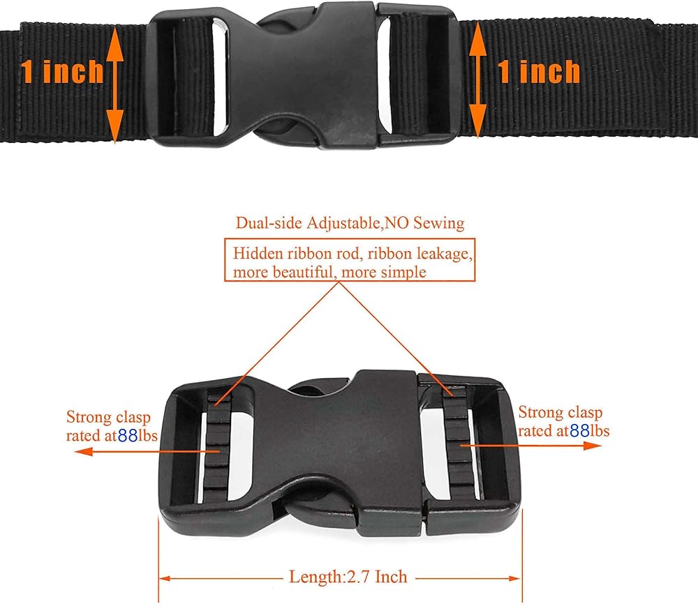 POM Material: Strong toughness plastic, The buckle is made of high-quality polyoxymethylene (POM). Hard strong side release buckles make your DIY stuff perfect and strong. Heavy-duty buckles are easy to install and adjust, with a smooth quick-release mechanism, make the webbing slide in and out of the ends with ease. the male and female buckles of the buckles produced by different manufacturers are not the same, please do not take them apart and mix them with other manufacturers' buckles