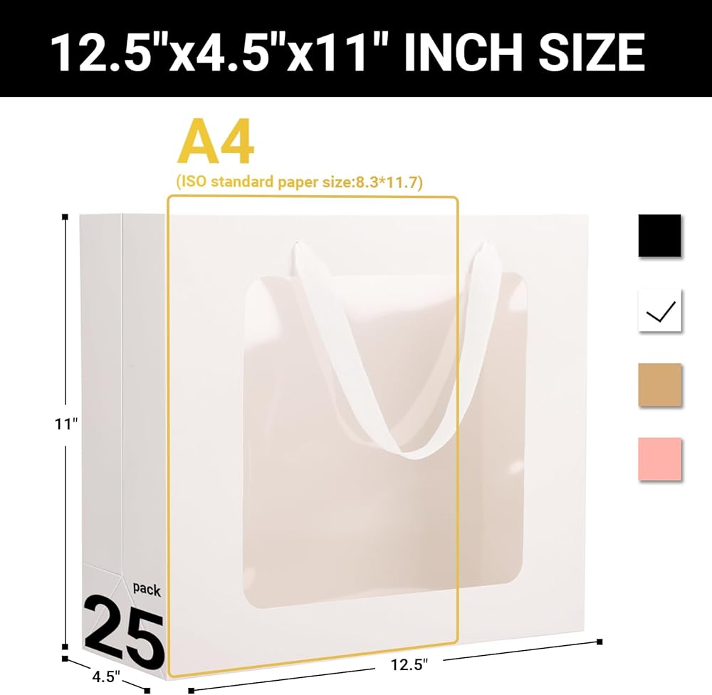 【Multiple Colors】 Choose from black, white,pink, or natural brown gift bags with handles in a size of 12.5"x4.5"x11"to fit any gift and occasion.