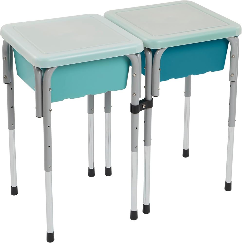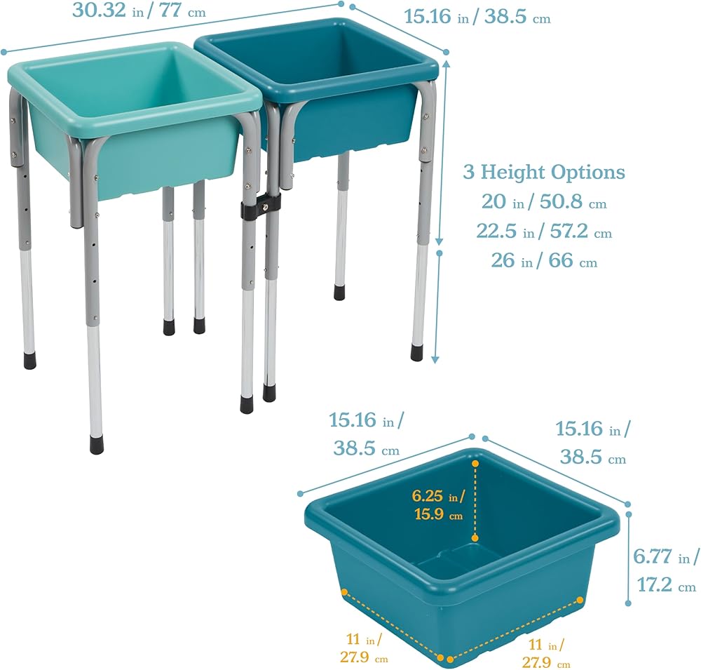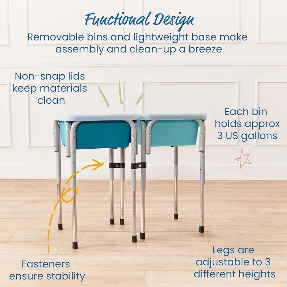 The ECR4Kids 2-Station Sand and Water Table is a versatile sensory table with bins and translucent lids designed to enhance hands-on learning and collaborative play experiences for toddlers and preschoolers. This durable plastic sensory table for toddlers offers two spacious open-area tubs allowing children to engage in sensory learning through tactile exploration. The sand and water activity table provides a dedicated space for water play, kinetic sand, and various sensory materials. The secure lid keeps the contents protected, making it ideal for both indoor and outdoor use. Whether you're a teacher looking to create an engaging classroom space or a homeschool parent seeking interactive learning opportunities, this sensory table is a perfect addition to your in-home learning space. Promote fine motor skill development, social interaction and encourage imaginative play. The adjustable design of the water table can be set up at three different heights, catering to kids of varying sizes. The sturdy legs with rubber feet have additional fasteners to ensure stability during lively play sessions. The sensory bins provide a convenient solution for easy clean-up. Simply remove bins with curved edges allowing for hassle-free maintenance, ensuring a clean and inviting play area.