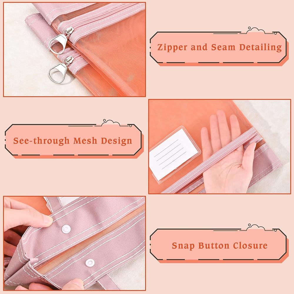 Zipper Pouch Size: Nylon mesh zipper bag, total size: 13.98 inch x 11.42 inch, enough for A4 size file, paper or other items storage. Note: If the zipper is not smooth enough you can rub the chain back and forth with a pencil lead