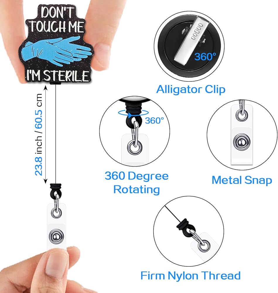 The acrylic badge reel is designed with funny arts. The vivid color pattern and funny saying are imprinted on the high quality glitter acrylic sheet. The badge reel comes with 360 degree spinning alligator pinch clip on back, sturdy alligator clip can be applied to firmly clip on clothes, shirts pocket, belts, backpacks or anywhere you want.
