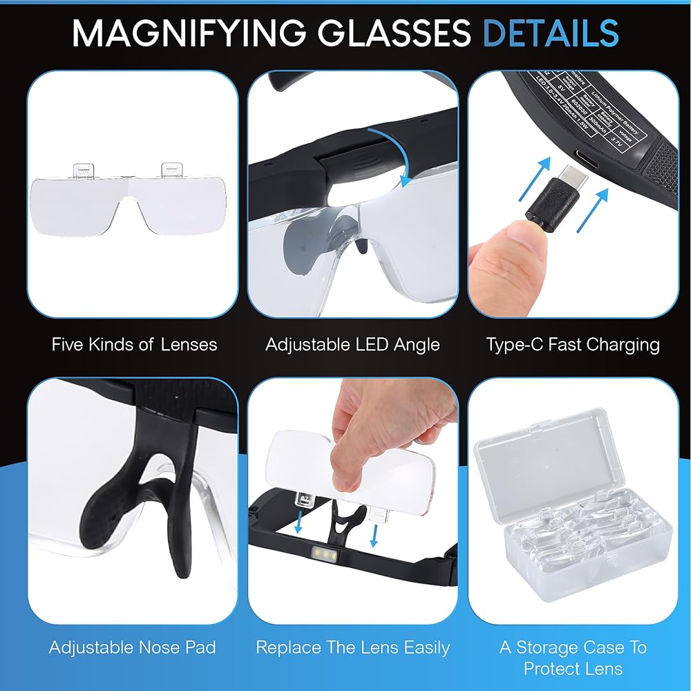 Interchangeable Lens Design: Switch between 5 optical lenses using a simple click and release system. Magnification power of the head magnifier: 0.75X, 1.25X, 2.0X, 3.0X, 3.0X. A 0.75x magnification power is a 75% increase in the magnified object's size.The lenses are made of acrylic resin, the surface hardness of the lenses reaches 5H grade, which is more wear-resistant and durable. The wider lenses provide you with wider field of view.