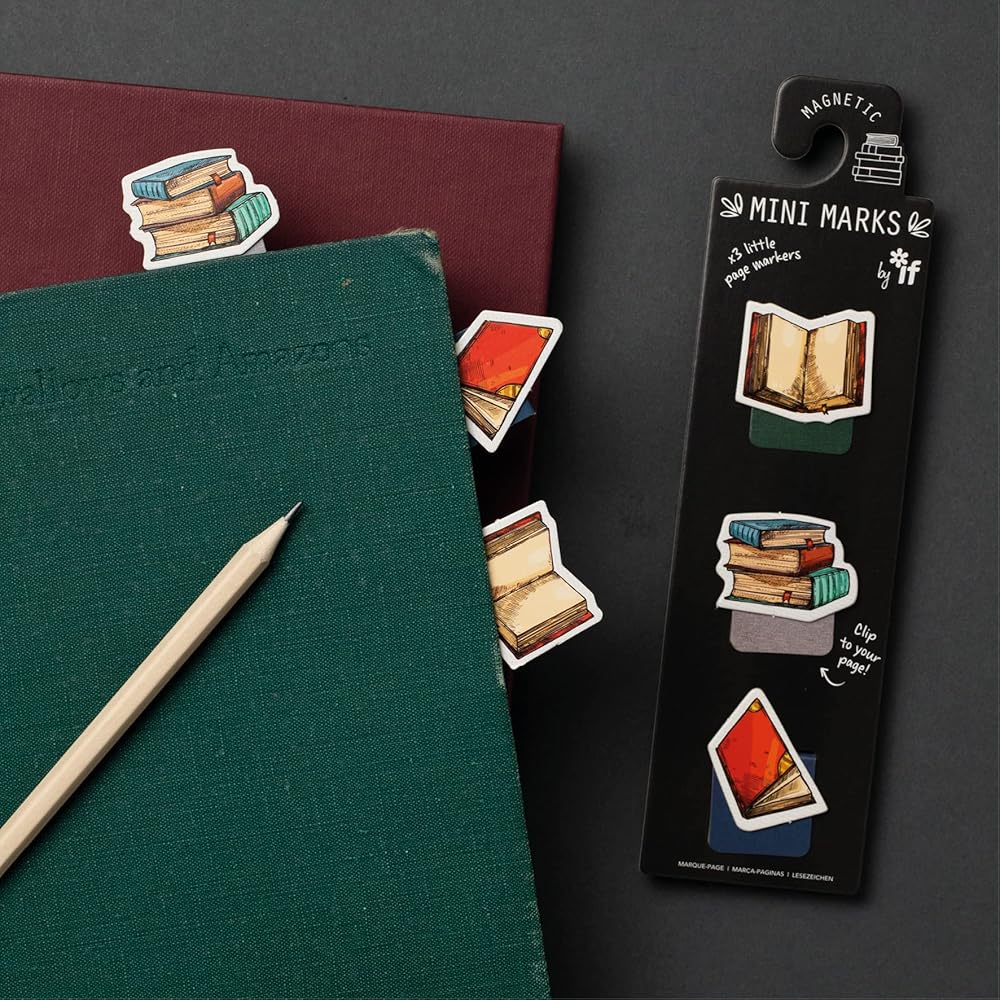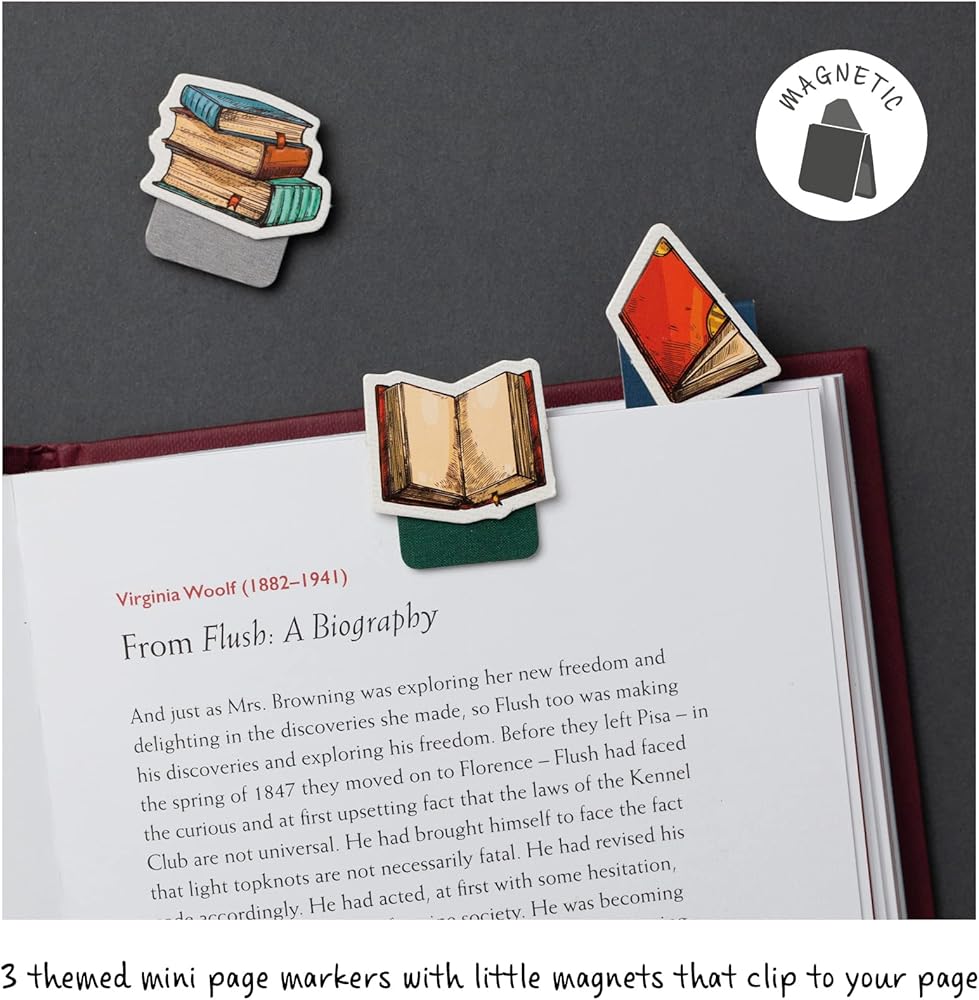 12 carefully chosen and popular themes that anyone from Grandma to a graduate will enjoy. Big on quality but mini in size with some special little embellishments here and there. Gentle but firm magnets designed to snap to the paper but not hurt your precious book pages. And Voila! A great gift for any book lover!