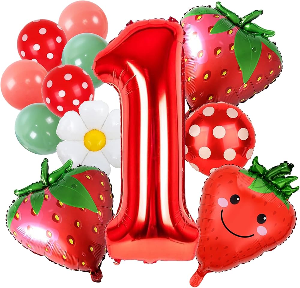 Package included :1pcs 40inch red number 1 balloon,2pcs 25 inch red strawberry foil balloon,1pcs inch strawberry foil balloon,1pcs 18 inch sunflower red foil balloon,1pcs Polka Dots rounded balloon,2pcs 12inch pink latex balloons, 2pcs 12 inch green latex balloons, 2 x 12 inch red white dot balloons,1 pcs ribbon,1 pcs straw.This ideal strawberry balloons are great as 1st birthday balloons, 1st anniversary or any first milestone.