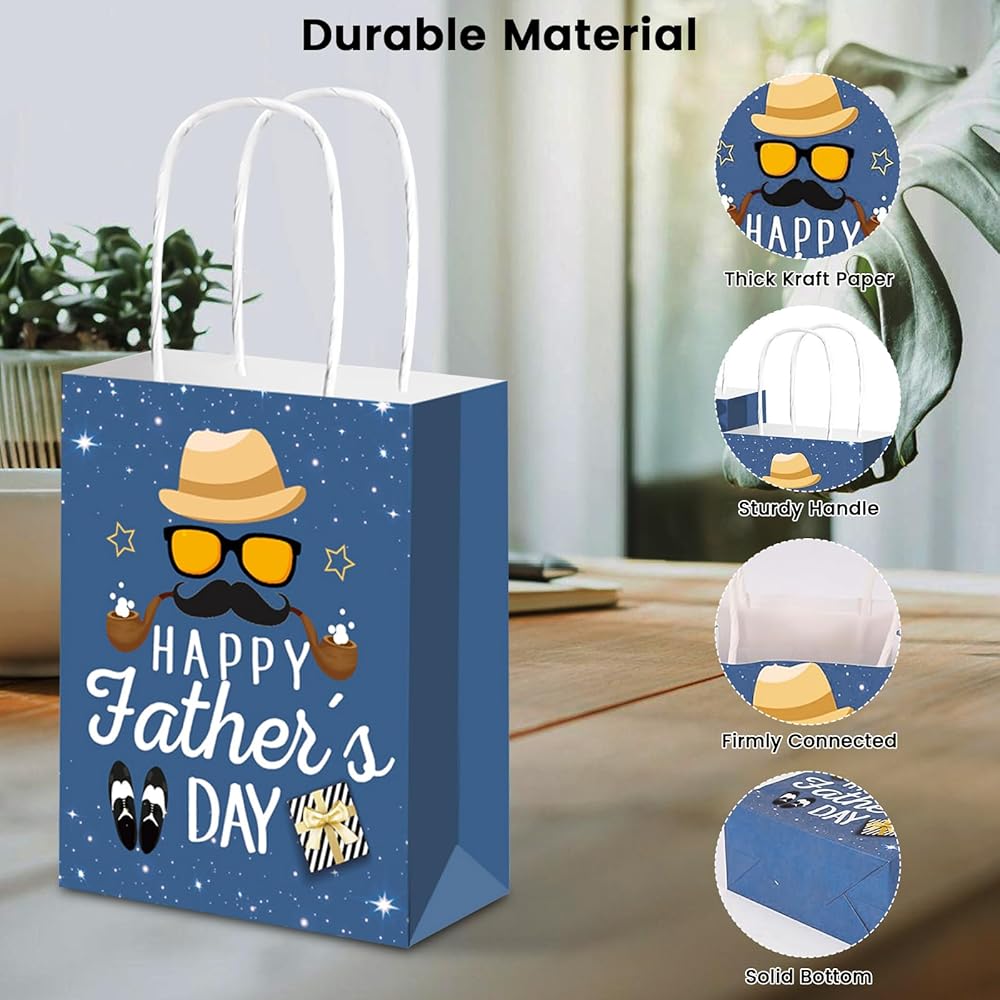 【Design】: This Father's Day paper bags come in classic blue and elegant black color, with a tool hat beard pattern printed on it, and a "Happy Father's Day" message on the background designed .White handles complete the beautiful look.
