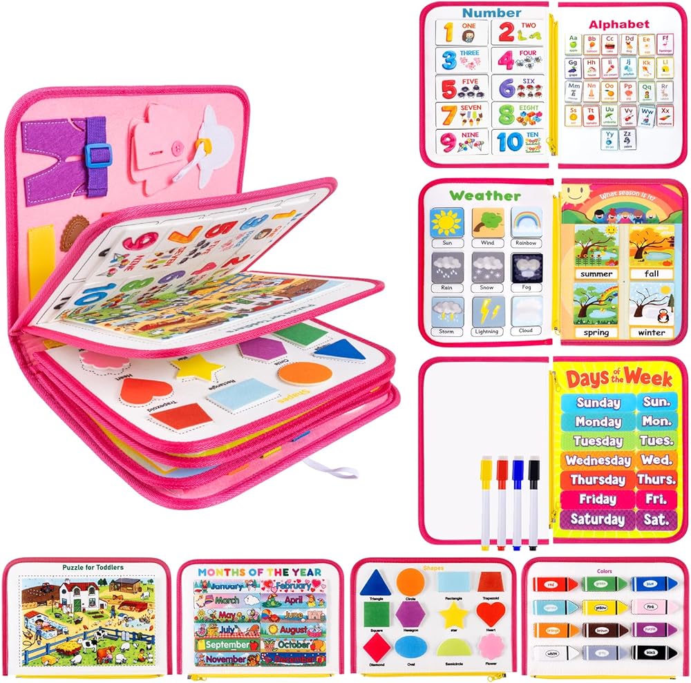 【12-PAGE Toddler Busy Board】Our busy board for toddlers is an educational toy for 1-4 years old boys girls to learn basic life skills.It includes multiple varieties of toddler activities.This busy book has 12 pages ,covering 10 themes:life skills, alphabets, math, flat puzzles, colors, shapes, months, weeks, weather, seasons.This sensory toy has a whiteboard to draw and write.The book helps preschool children to enhance hand-eye coordination, exercise fine motor skills of fingers.