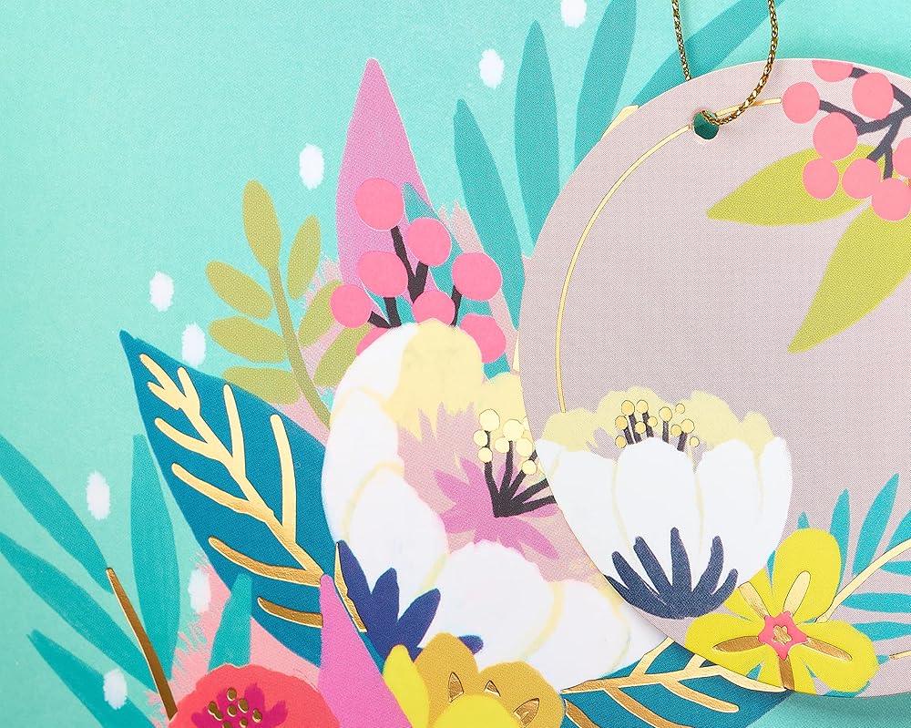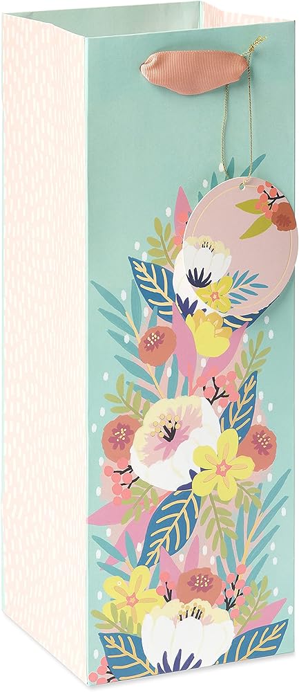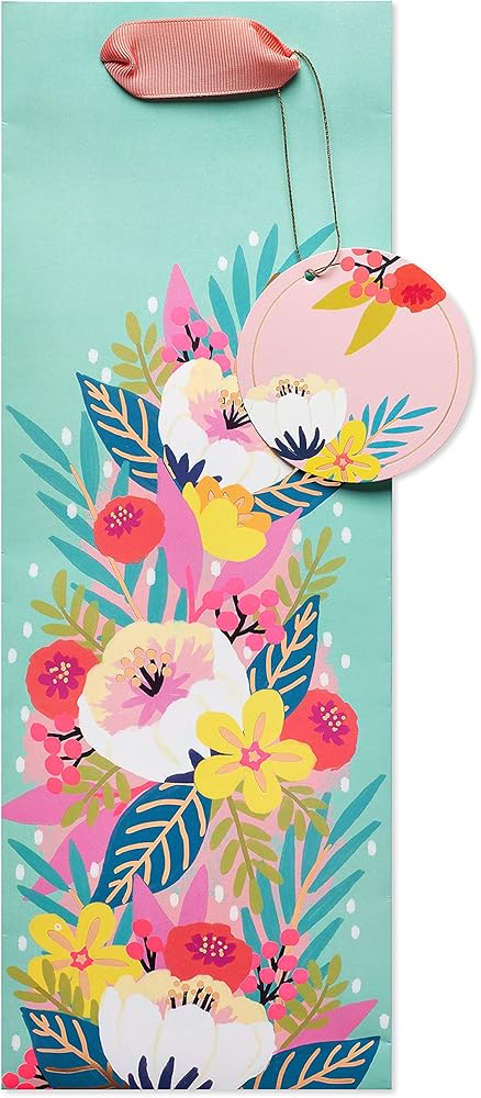 Toast someone special with this beautiful beverage gift bag from Papyrus! This contemporary premium bag features a bright floral design with foil embellishments, a pretty matching gift tag, and pink textured ribbon handles. Make your gift presentation even more extraordinary with Papyrus tissue (sold separately) to fluff or fold for the perfect finishing touch. This bag is perfect for the wine, spirit, or beverage of your choice. Crafted with the finest materials, Papyrus gift bags are sure to enhance your gift presentations in unique ways!