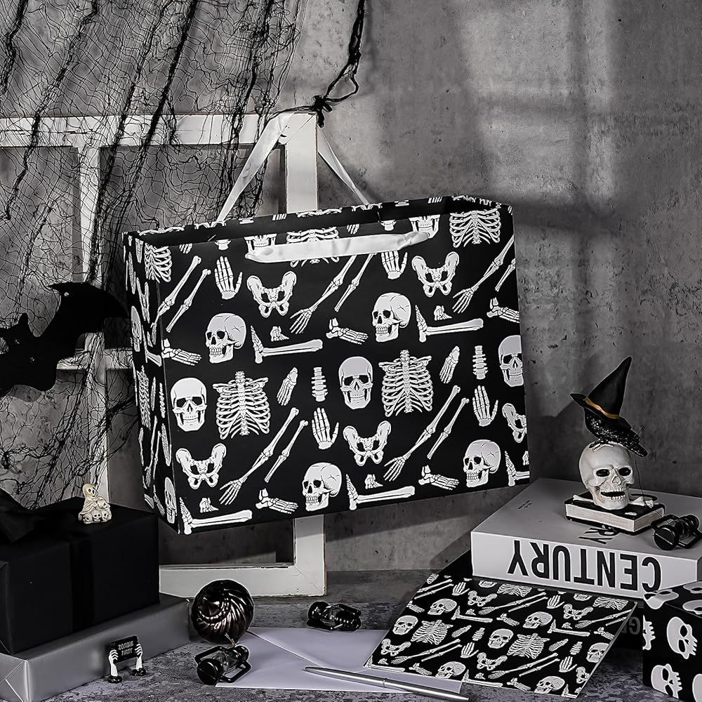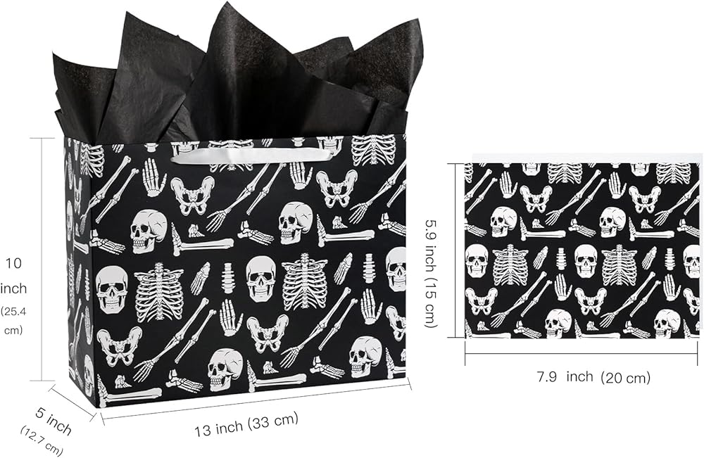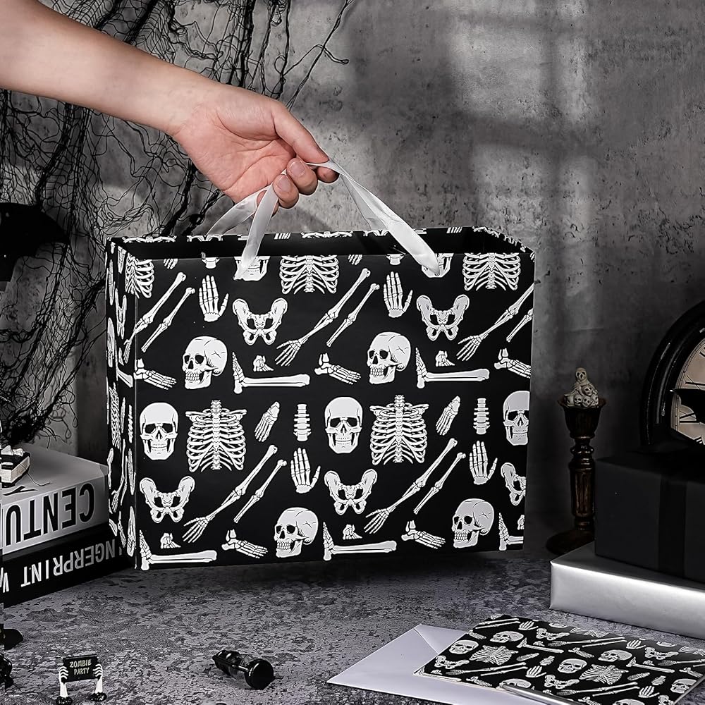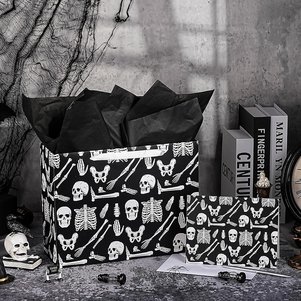 WRAPAHOLIC Skeleton Halloween Large Gift Bag with Tissue Paper and Card - 10 x 5 x 13 inch - Creepy Skeleton Hallloween Paper Bag for Holiday, Party Gift Wrap