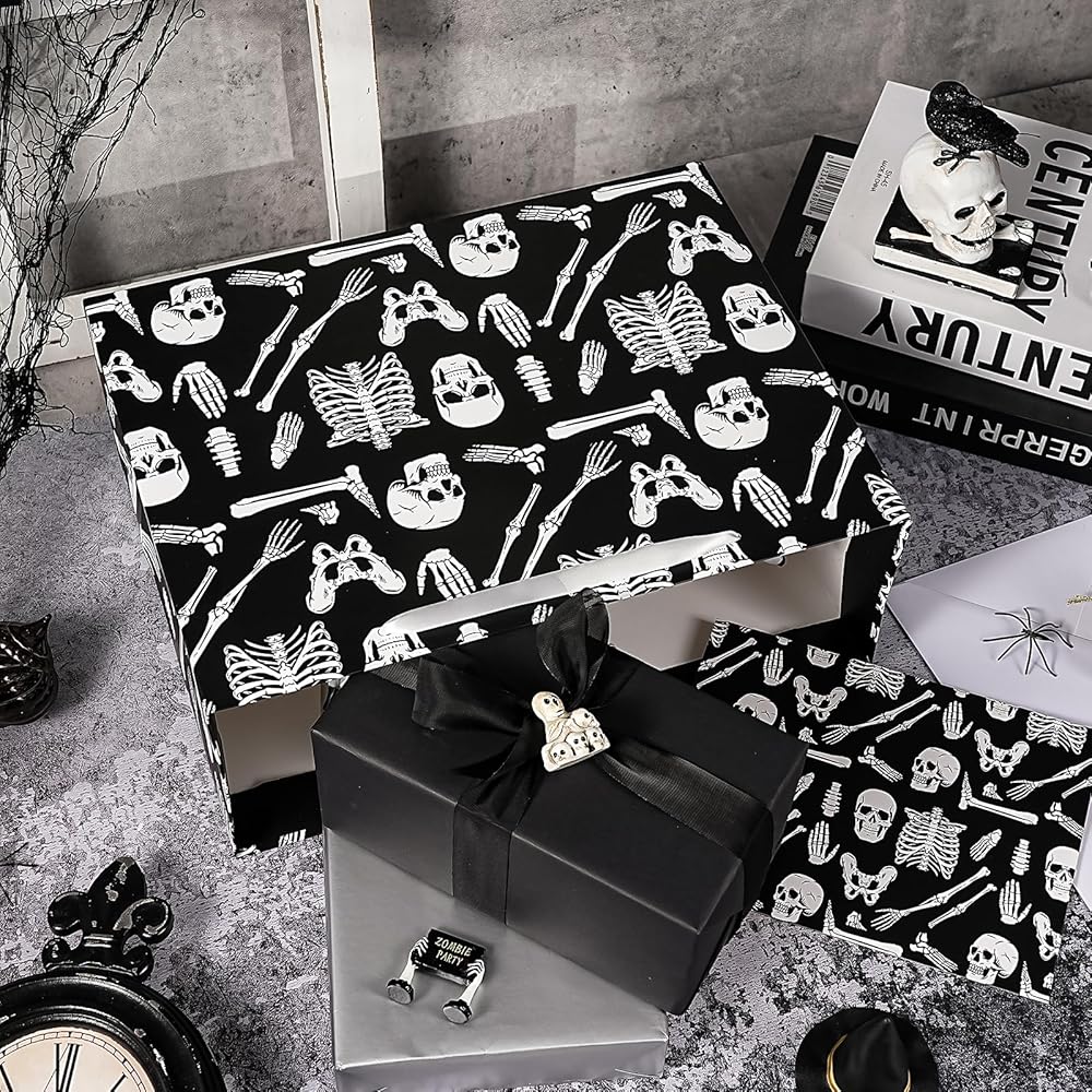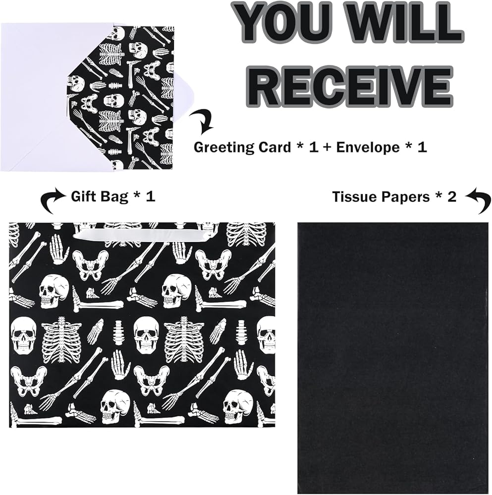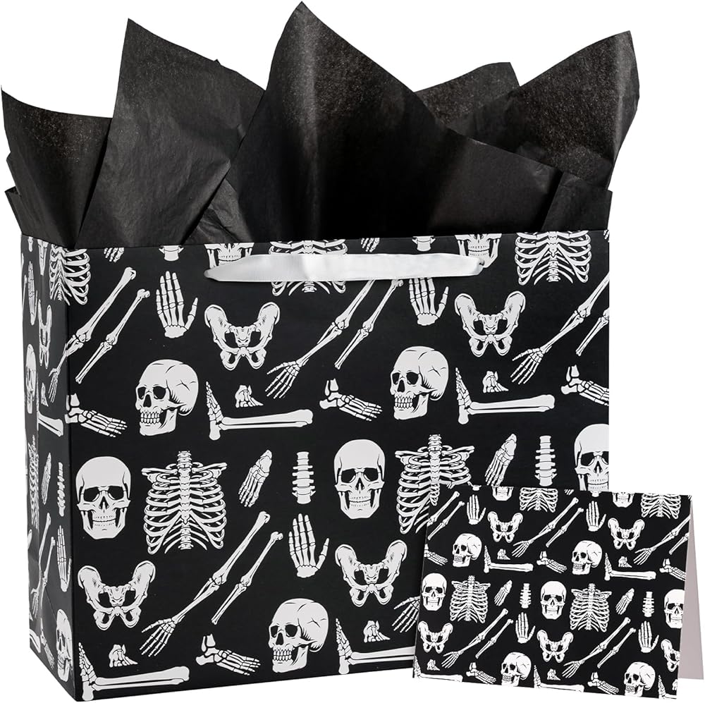 WRAPAHOLIC Skeleton Halloween Large Gift Bag with Tissue Paper and Card - 10 x 5 x 13 inch - Creepy Skeleton Hallloween Paper Bag for Holiday, Party Gift Wrap
