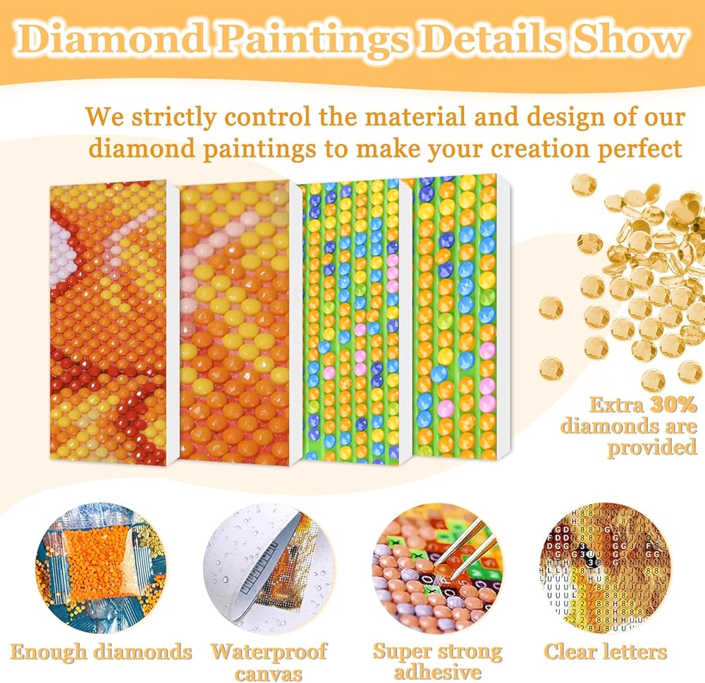 EXCELLENCE IN QUALITY: Diamond paintings are made of high quality canvas, which is waterproof and has an even texture, making it easier to attach the diamonds and keep the pattern as it was originally intended. diamond art kits lettering symbols are clear and easy to read. Diamonds are durable, not easy to fade, individually packaged