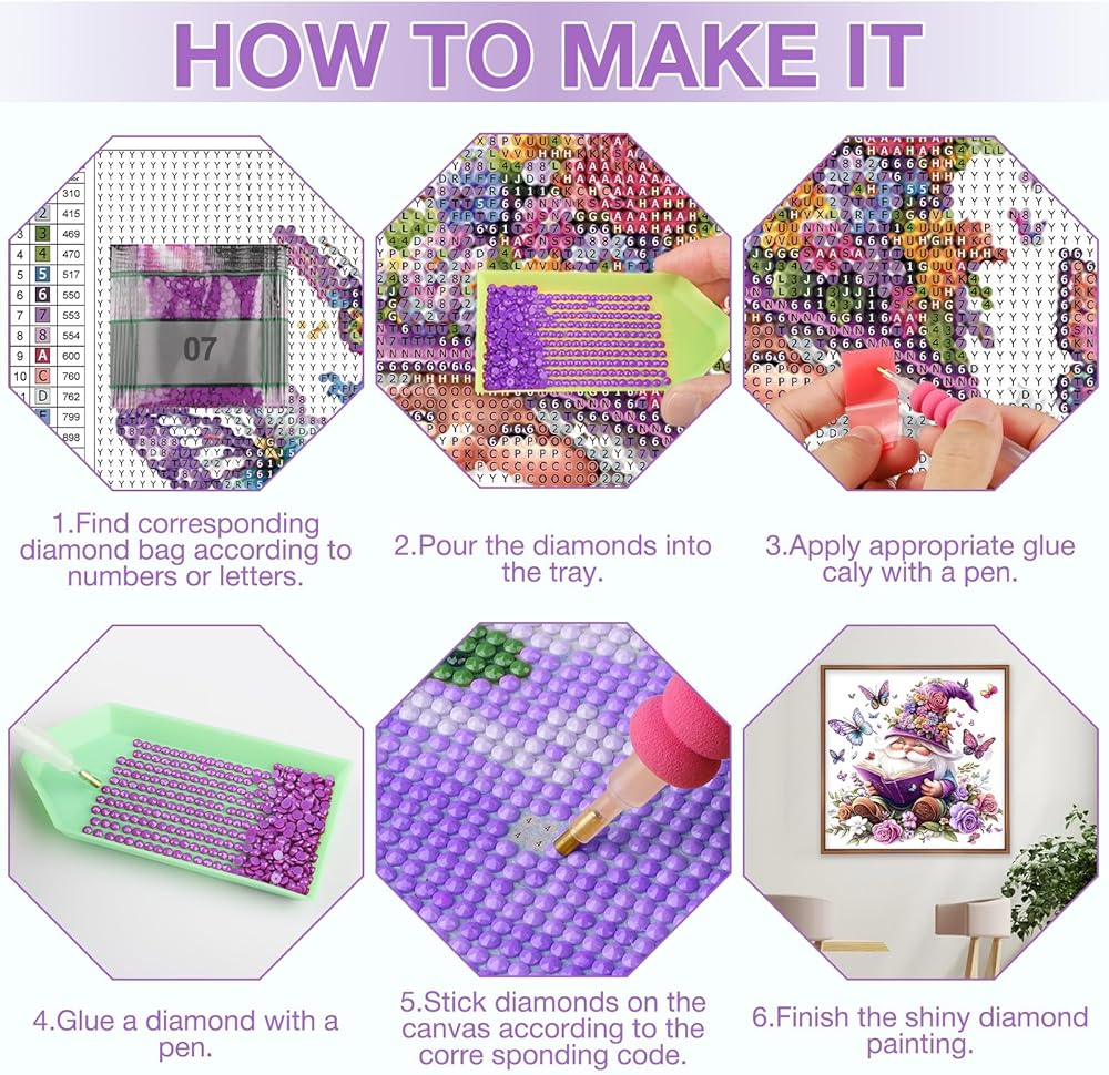 DIAMOND PAINTING KIT INCLUDES: The Diamond Painting Kit comes with all the tools needed, you will receive the following tools 1x canvas, 2x diamond pens, 1x diamond tray, 1x glue clay, 1x replaceablecorrection pen, 5x ziplock bags for diamonds and enough colorful diamonds to start your wonderful DIY experience.