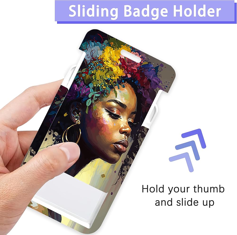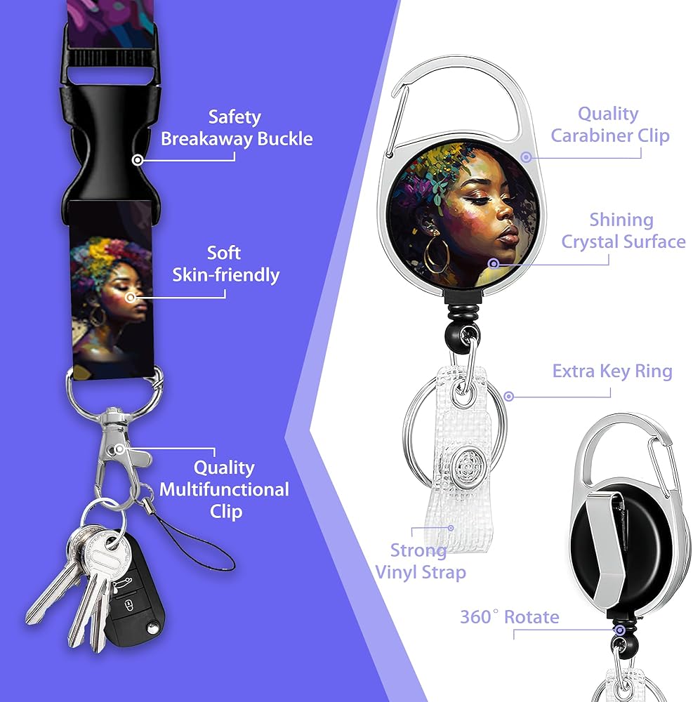 Lanyards for Id Badges,African Girl Id Badge Holder Heavy Duty and Retractable Keychain,Watercolor Flowers Badge Reel with Carabiner Clip,Women Student Doctor Office Gifts