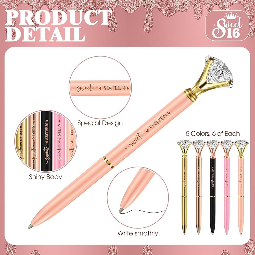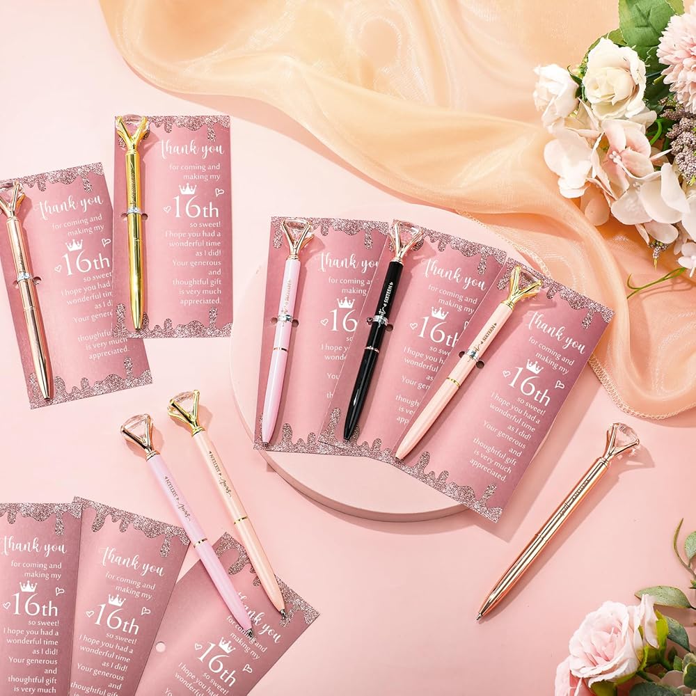 Party Supplies: our cute, glittery Sweet Sixteen ballpoint pens packaged with pink thank you cards offer the mix of elegance; These pens aren't just functional, but a stylish sweet 16 party favor that your guests can flaunt, reminding them of the fabulous time they had at your event
