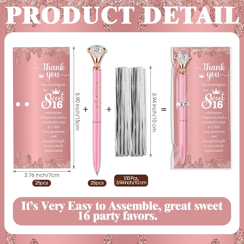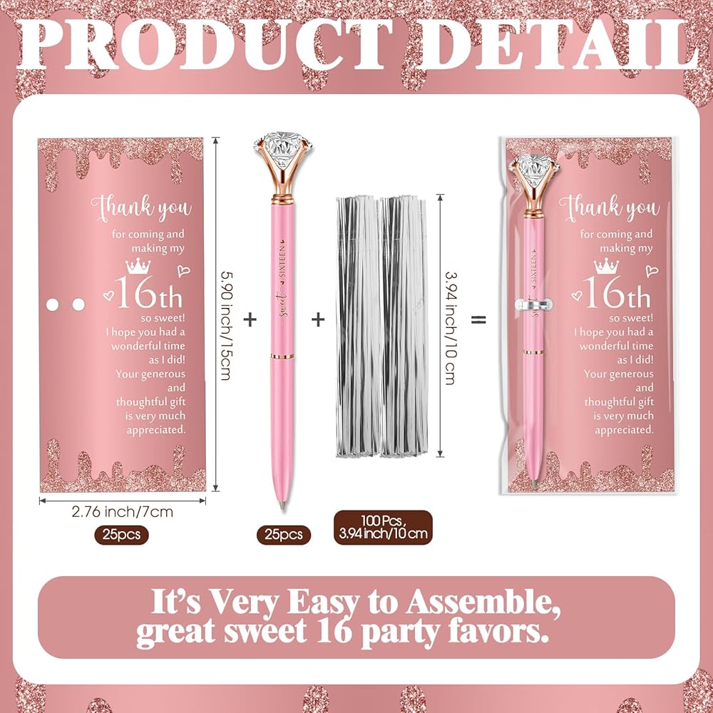 Plenty of Gift Sets: throw a memorable event with our Sweet 16 birthday gifts for guests; The package includes 25 glitter sweet sixteen ballpoint pens, 25 thank you cards, and 100 cable ties making it an unmatched collection of sweet 16 party favors; It ensures your guests have a lasting impression of your event and a token to treasure
