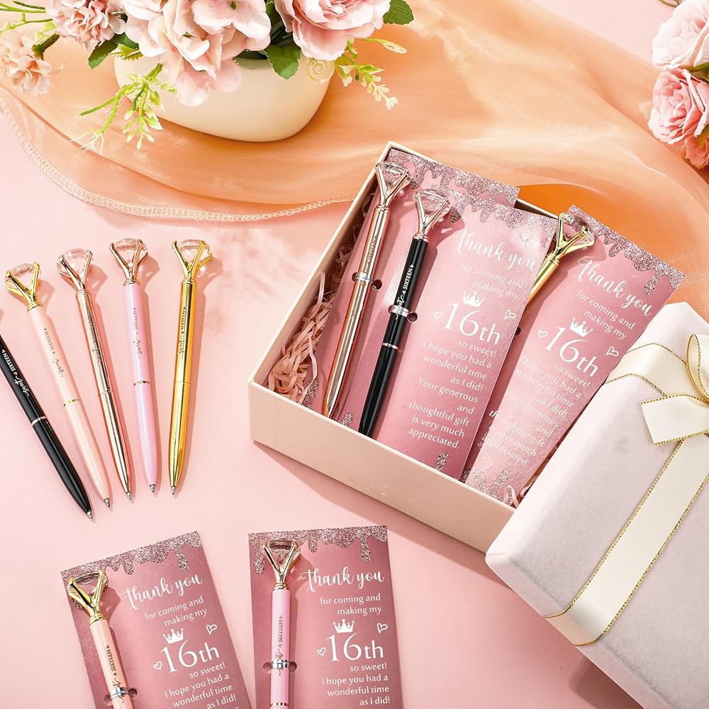 Robust and Long Lasting: every component of this Sweet 16 birthday gift package is designed with quality in mind; The pens are made of robust plastic with a glitter finish that shimmers; Each thank you card is printed on quality paper to communicate your heartfelt appreciation; You can be confident that these sweet 16 gifts will stand the test of time