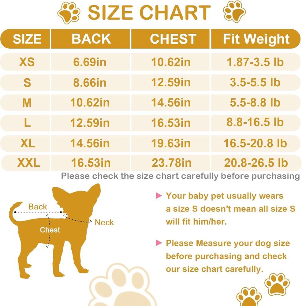 Dog Tutu Dress SIZE:X-Small- Chest Girth:10.62", Back Length:6.69", Suggest weight 1.87-3.5 lbs. Our puppy dress only suitable for Small Dog breed, such as Teacup dogs, Chihuahua & Yorkie. so our sizes are much smaller than other common pet clothes, please measure your pet and refer to the size chart before purchase.