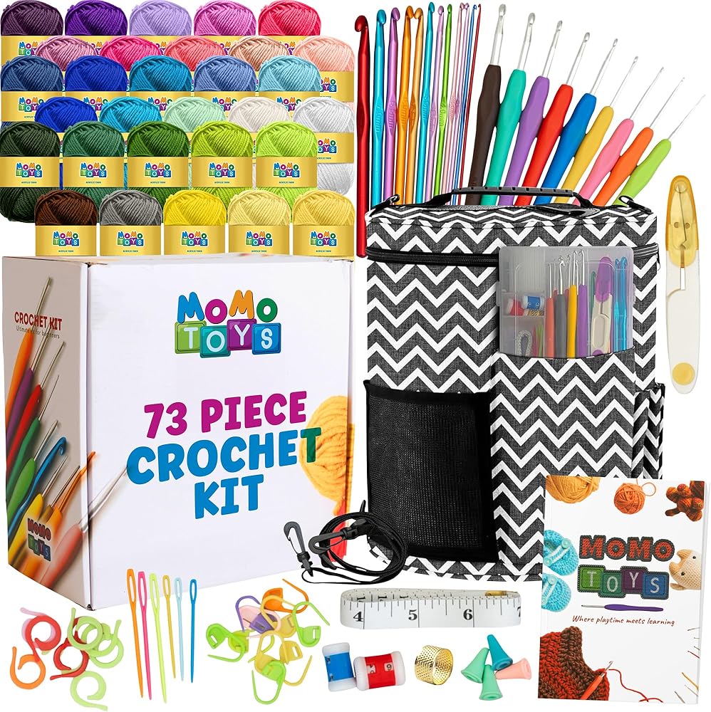 COMPLETE CROCHET KIT: Our beginner's crochet kit includes a versatile 9pcs of rubber crochet hooks, 15 colorful yarns, 12 metal crochet hooks, 10 stitch holders, 6 sewing needles, 4 point protectors, 2 row counters, 1 book and 1 goodie bag, perfect for learning and creating various projects. It provides everything beginners need to start crocheting scarves, hats, and more.