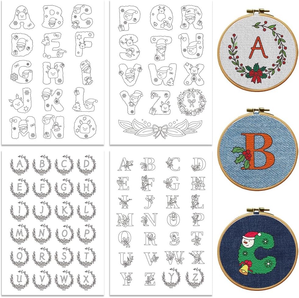 Peacoblue Water Soluble Embroidery Patterns for Beginners, 26 Christmas Letters Santa Claus 4 Sheets with 80pcs, Wash Away Embroidery Pattern Stabilizer for Hand Sewing Lover Women Adults