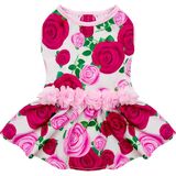Dog dress in elegant rose printing with florals decor sewed around waist line, exclusive design, great for everyday wear, party wear and birthday wear.