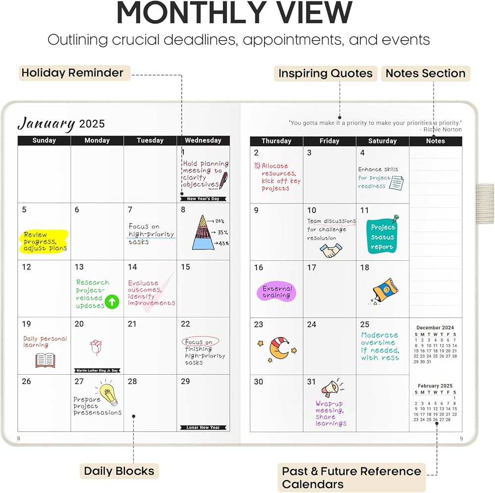 Organize and Inspire: Experience the structure and encouragement of ZOTIA's 2025 Planner. With its functional design, inspiring elements, and practical features, it's the perfect choice for anyone who values organization and efficiency. End the year strong with 2025 planner that supports your every step.