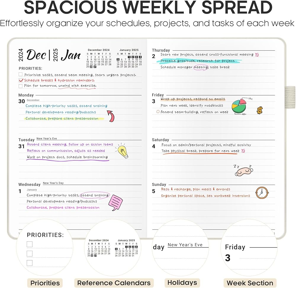 Versatile for All: Perfect for students, teachers, professionals, and homemakers alike, this 2025 planner meets the diverse needs of any busy individual. Use it to manage school assignments, work projects, family events, and personal goals—all in one convenient place.