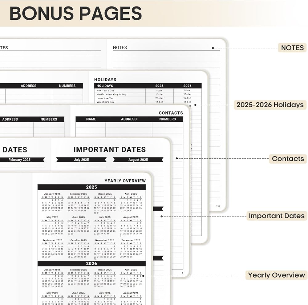 Thoughtful Touches: ZOTIA's 2025 planner is equipped with thoughtful details that enhance your planning experience. An elastic band keeps it securely closed. A clear double-sided pocket provides extra storage for notes or reminders.