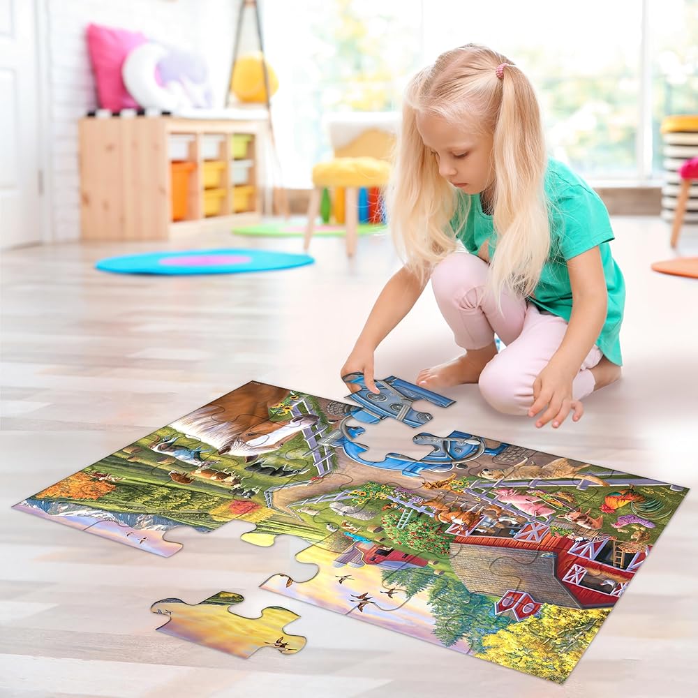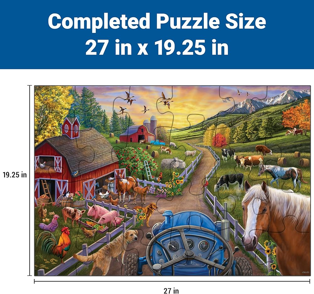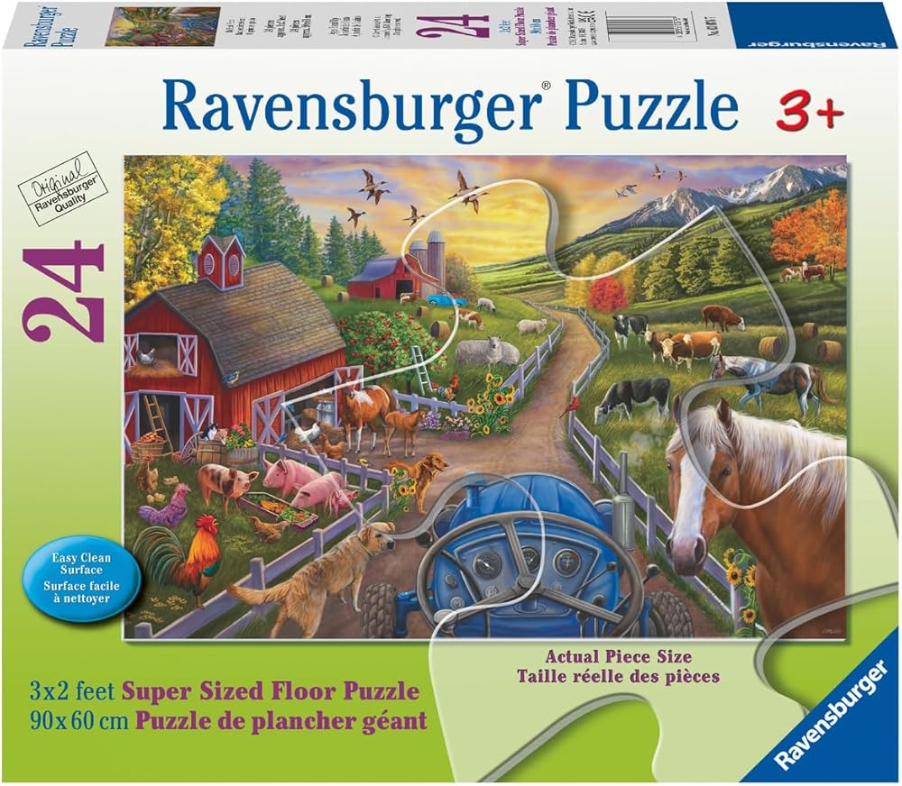 It's tractor time in our "My First Farm" puzzle! The day is dawning as rooster cock-a-doodle-doos. The pigs are slurping up their slops while the cows, horses and sheep munch on their morning meal. The apples are ripe and ready to pick. Time to haul some hay bales into the barn for the coming winter! Spark children's imaginations while they develop hand-eye coordination, fine motor skills and problem-solving through repeated practice. Build a puzzle and harvest valuable skills! This 24-piece floor puzzle has giant, durable pieces little hands can easily hold on to for lots of repeat fun! Clean-cut pieces and Ravensburger's tight interlocking fit provide a pleasurable puzzling experience for children and their adult helpers alike. With piece counts children can grow with, our Perfect Age Fit criteria ensures this puzzle is fun and educational for ages 3 and up! About the Artist: Artist Cory Carlson travels the world to capture rare moments of animals in their natural environment. He and his jewelry-artist wife say discovering natural treasures, whether in the remote African jungles or the farmlands of America, is always a joy. Cory is an avid preservationist whose work has been used by numerous conservation organizations to help raise funds and awareness for the protection of wildlife. Cory seeks to bring the beauty of nature into people's lives through art. Finished puzzle measures approximately 36 x 24 inches (90 x 60 cm).