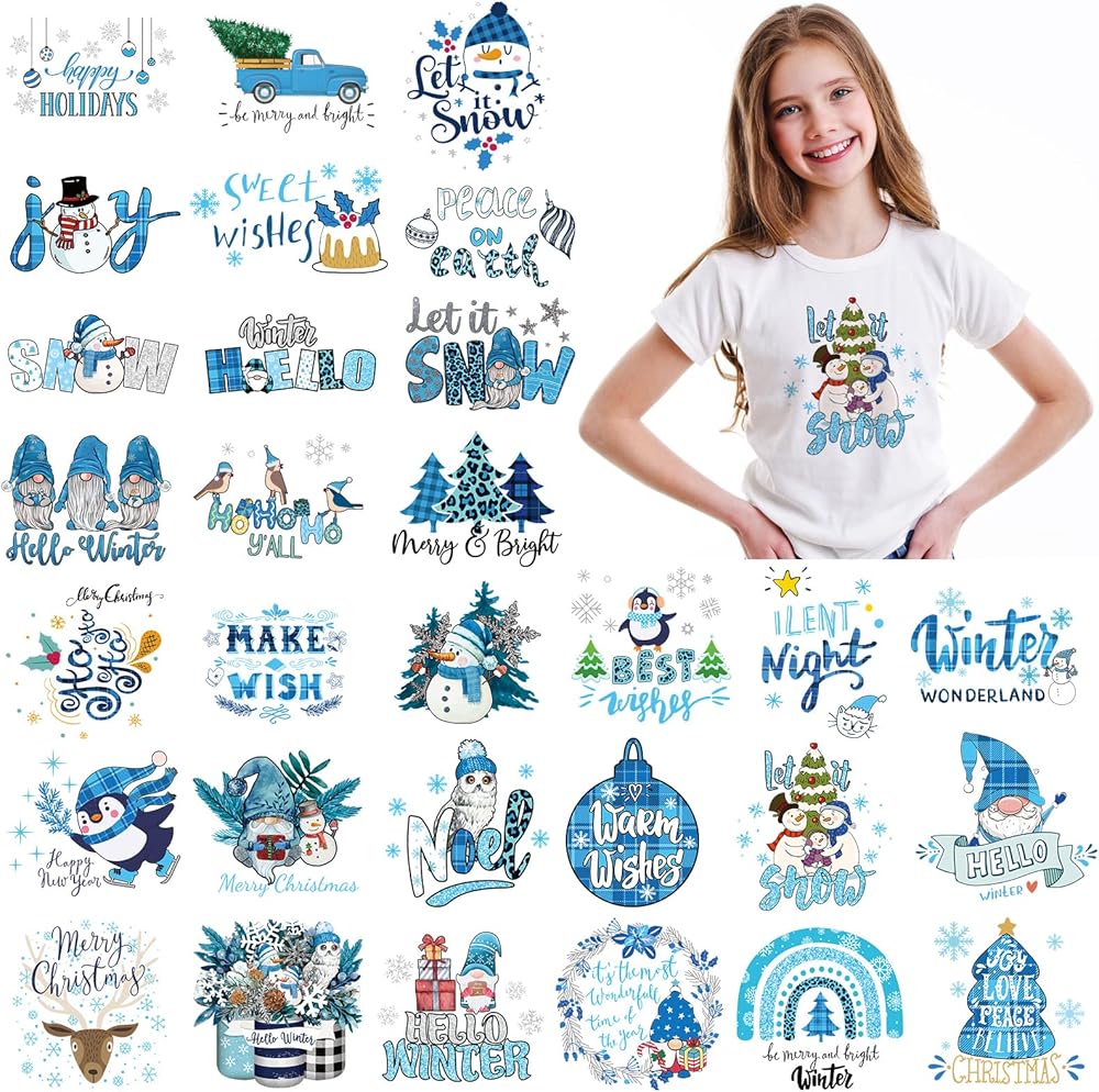 Ferraycle 30 Pcs Winter Iron on Transfers for T Shirts Snow Heat Transfer Blue Ready to Press Decals Stickers Patches Design for Clothing DIY Craft Decoration(Winter Theme)
