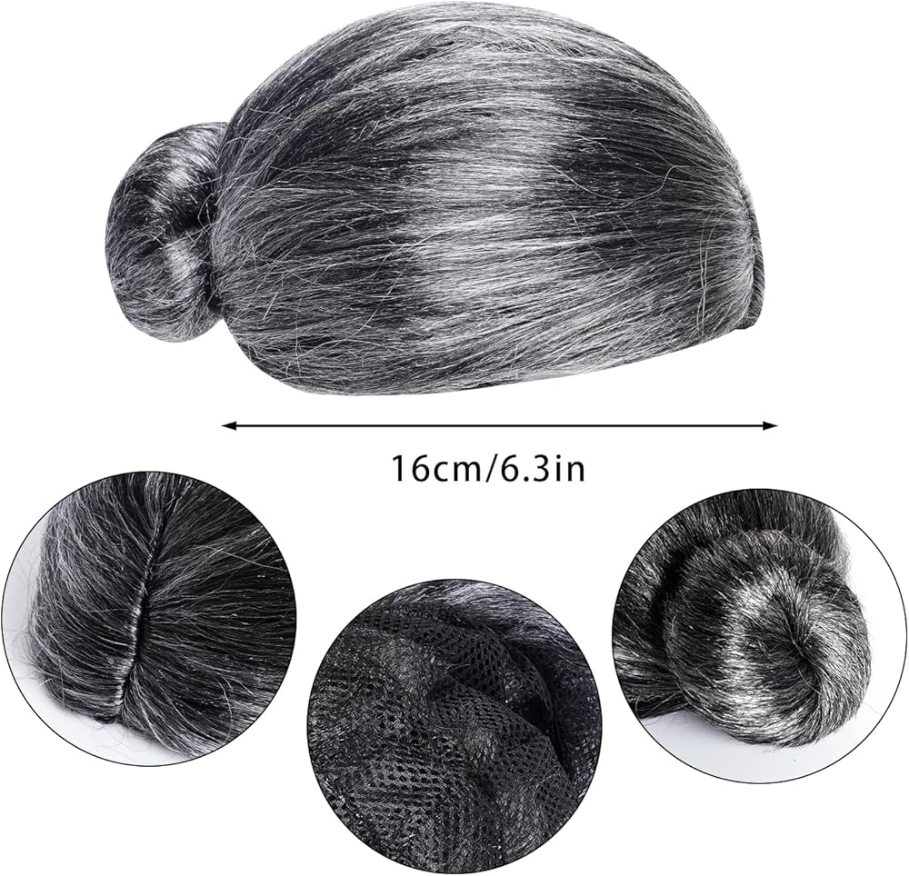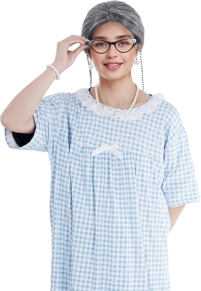 Package Includes:Old lady 100 days outfit includes grey straight wig, wig cap, round old lady glasses with eyeglasses chain strap, granny cane, faux pearl beaded necklace, earrings, bracelet