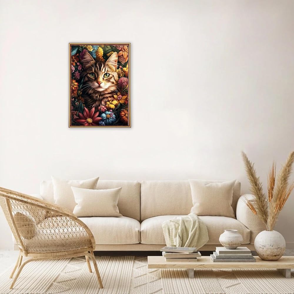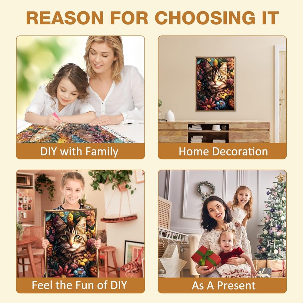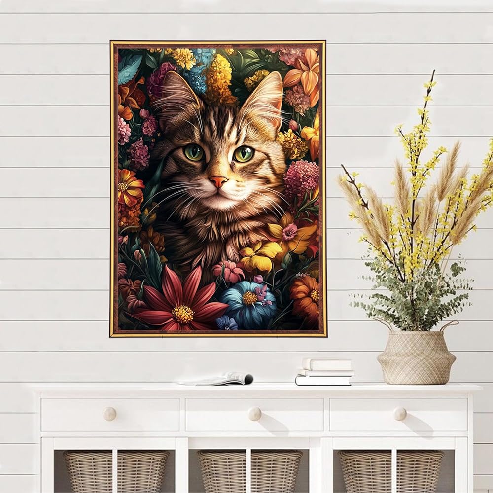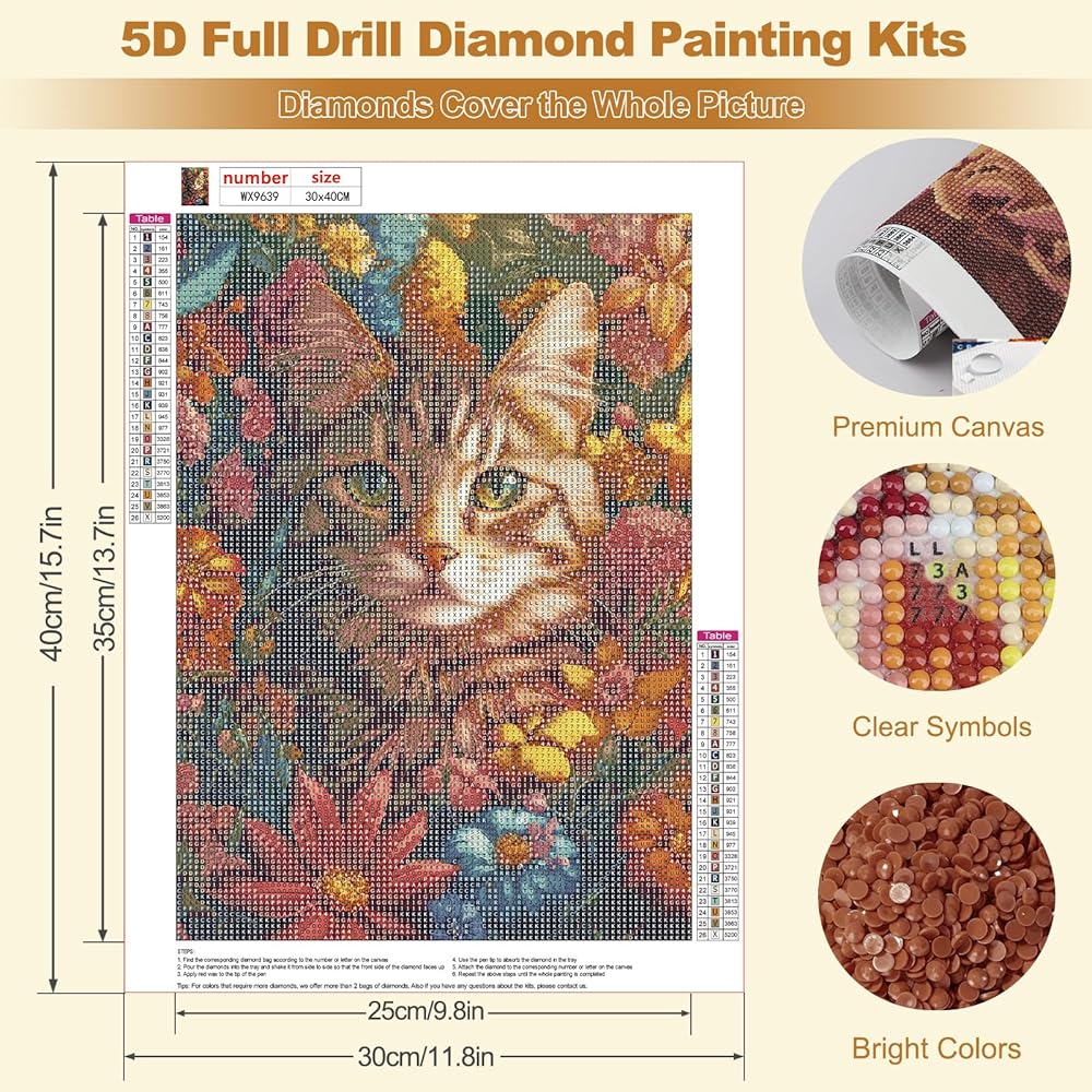 MEIYUDA Cat Diamond Painting Kits for Adults, 5D DIY Flowers Cat Diamond Art for Adult Beginners, Round Full Drill Crystal Craft Kits for Home Walls Decoration and Presents 12x16inch