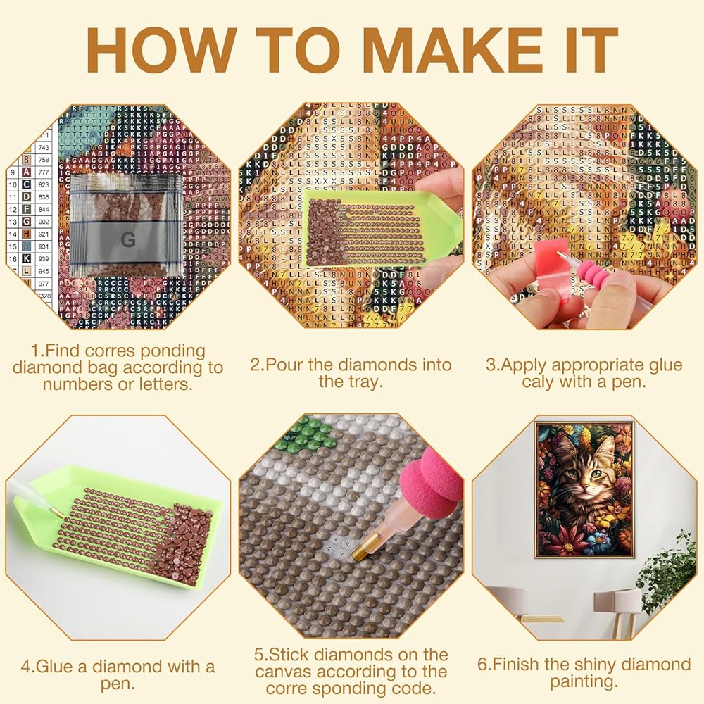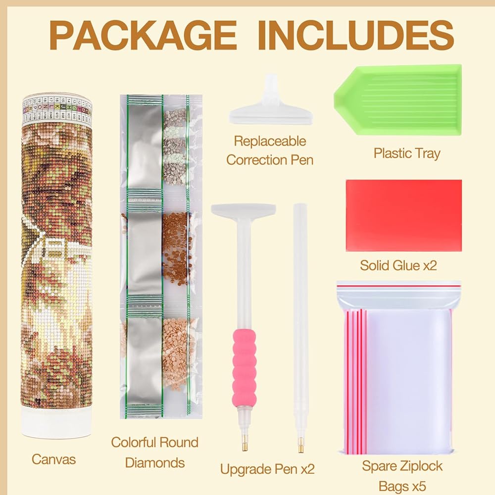 DIAMOND PAINTING KIT INCLUDES: The Diamond Painting Kit comes with all the tools needed, you will receive the following tools 1x canvas, 2x diamond pens, 1x diamond tray, 1x glue clay, 1x replaceablecorrection pen, 5x ziplock bags for diamonds and enough colorful diamonds to start your wonderful DIY experience.