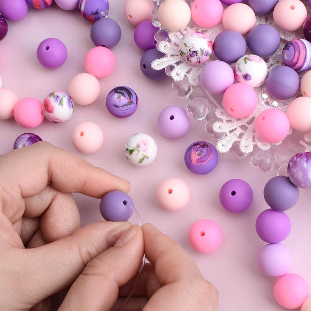 【PACKAGE CONTENT】You will receive 100pcs of pink and purple mix silicone beads set, including round beads,spaced beads and string. You can refer to the Picture 2 for detailed dimensions.