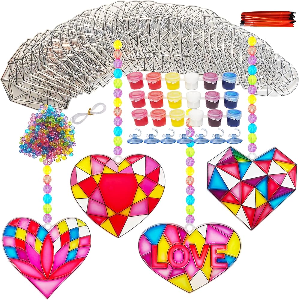 28 Sets Valentine Suncatcher Craft Kit:28 sets valentine's day suncatcher ornament decoration includes 28 pcs heart sun catchers in 4 designs, 3 strips of 6 color suncatcher paints,28 paintbrushes, 300 pcs acrylic beads, 1 roll of 393" fishing thread, 28 pcs suction hooks,complete accessories for easy suncatcher DIY painting.Use our diy window paint art suncatchers to make unique decorations for your home or party.