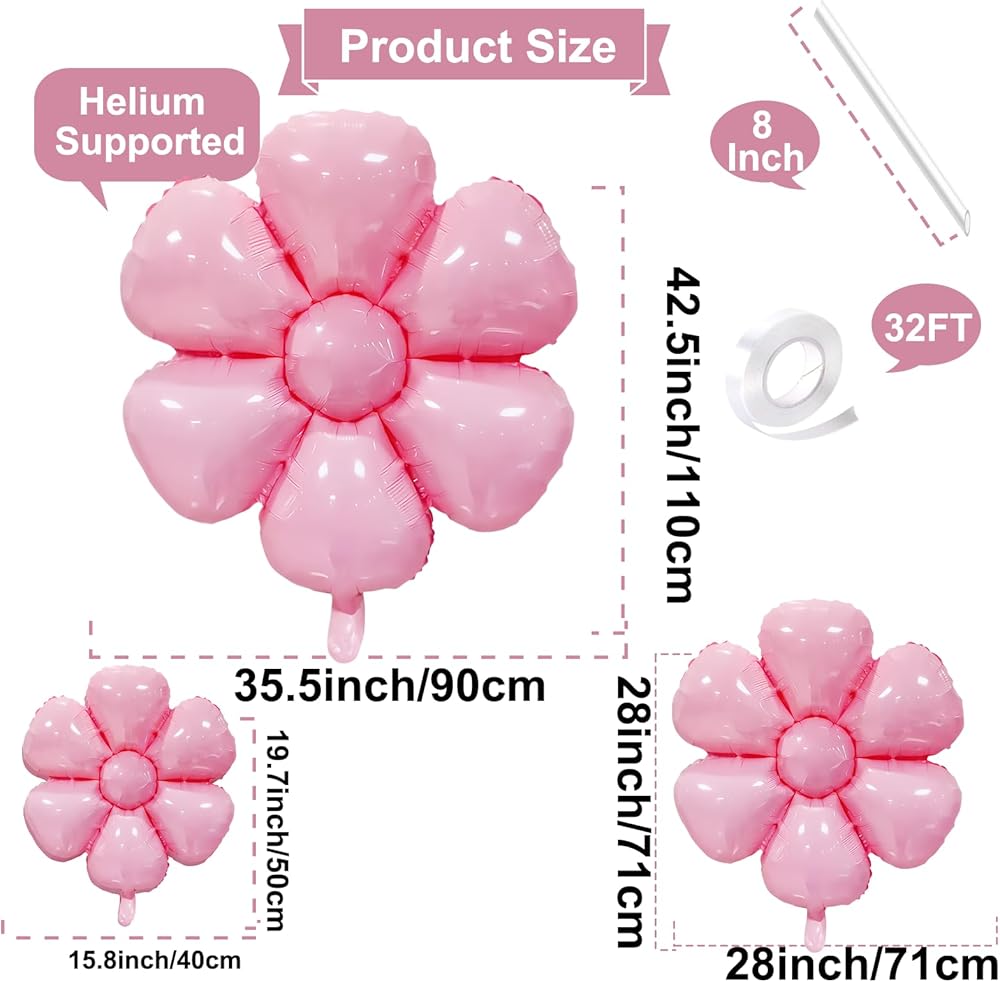 PREMIUM QUALITY DAISY BALLOONS: This set includes a total of 14 daisy flower balloons in three different sizes - 8 pieces of 19 inches, 4 pieces of 28 inches, and 2 pieces of 43 inches. Each balloon is made of high-quality aluminum foil material, ensuring durability and a realistic appearance. These balloons are perfect for daisy flower-themed parties, birthdays, baby showers, weddings, or groovy boho daisy party decorations.