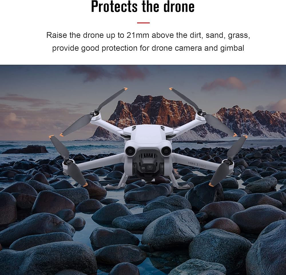 Protect the gimbal and the fuselage. Effectively increase the height by 15MM to avoid the ground debris of the drone from contaminating the fuselage or damaging the gimbal during take-off and landing. The ground can still be taken off and landed.