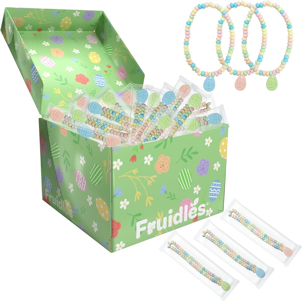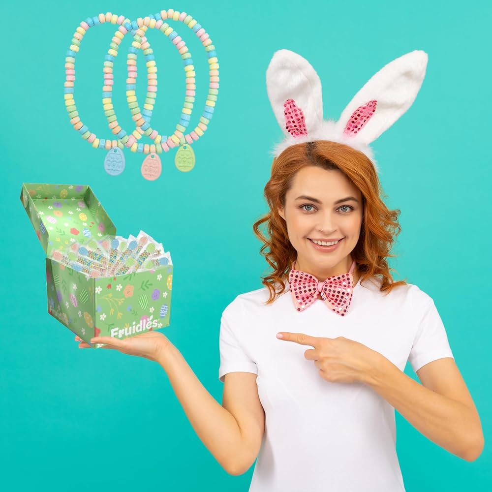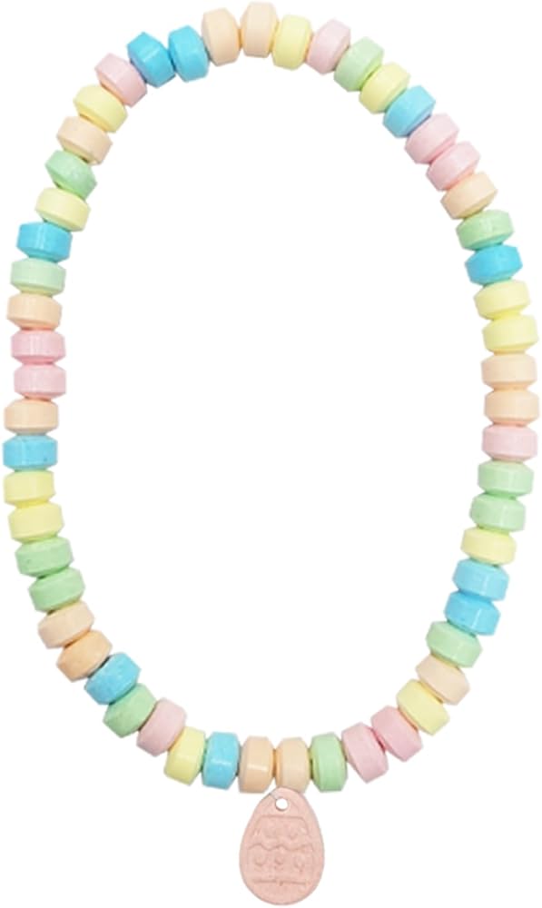 A Set Of Charms: Easter Bunny Candy Necklace in pastel colors of pink, yellow, violet, orange and green. Strung together on elastic cords to fit the size of your kids' cute Necklace and so tasty that you'll be able to enjoy these pieces for hours and hours. A delicious type of sweet to keep around the house and snack on when you please. It's a fun way for children to make friends as they share a bulk of delightful wrist-sized beads. They can play at home while melting and chewing them inside their mouth. With our fantastic edible jewelry, your girls & boys can bring a piece of elegance wherever they go. A creative way to let your Kids imagine their future as a fashion model or live up to their fairy-tale world. It encourages role-playing, storytelling, and creativity. These cute collections are a great addition to buffet bars, dessert toppers, Easter gift baskets, or yummy bag fillers. They also work as prizes and rewards. These goodies are individually wrapped to be secure from other contaminants. These Hard Candies are Fat-free and Gluten-free, and are sure to paint a smile on little faces! Melt them inside your mouth and you will feel nostalgic for your own childhood