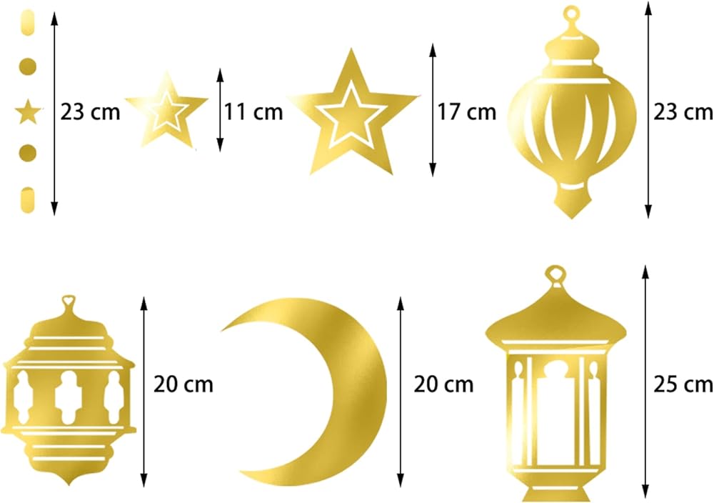 【Package Contains】12 strings 90cm different shape iridescent euphoria shining streamers garland.4pcs star shape,2pcs moon shape,6pcs lanterns shape.Every garland is individual. 【Material】The material is double side gold glitter paper,reusable. With the navy blue silver color hanging decorations the party or home decoration become more elegant and vivid. 【 Easy to hanging 】Just open the package to hang the banners directly no need to diy again.Because they have been sewn together, which is really convenient for you. 【Using Occasion】They are perfect for ramadan decorations, eid decoration,ramadan mubarak decor,weddings,birthday,twinkle twinkle little star decorations,eid mubarak decor. 【Quality Guarantee】If you ever have any concern with our paper garlands,just contact us and we"ll make it right!