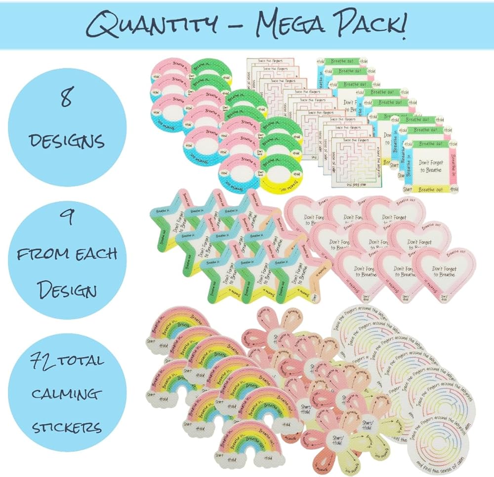 Sensory Stickers Balk With Many Designs - The textured sensory stickers offer 8 different styles, including box breathing sensory sticker, finger labyrinths, flower, star, rainbow, heart, and more