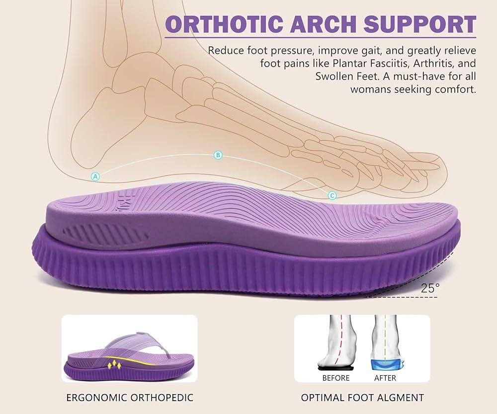 ORTHOPEDIC FLIP FLOPS FOR WOMEN with 1.2" protective deep heel cup and 6mm heel-toe drop height to provide improved stability and support. Flip Flops for Women with ergonomic Arch Support can relieve stress on feet and joints and improve gait. Orthotic Flip Flops for Women is a must-have for all woman seeking comfort, ideal for Plantar Fasciitis, Arthritis, and Swollen Feet.